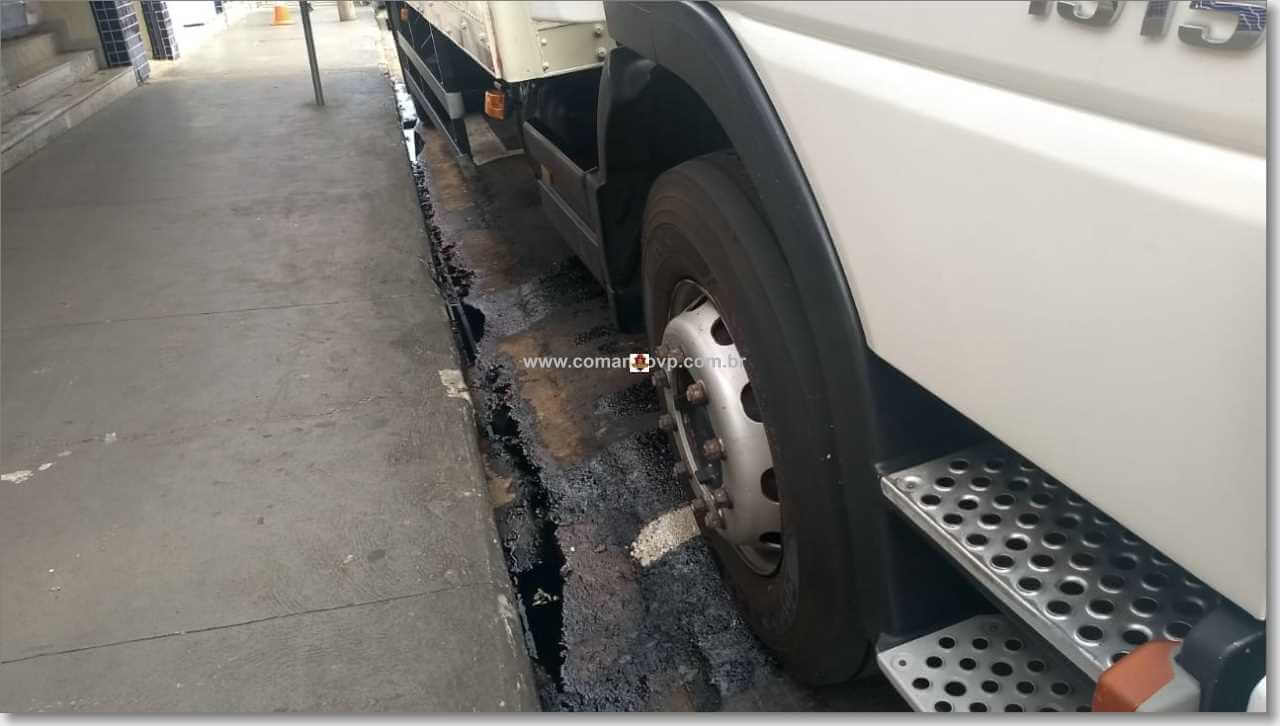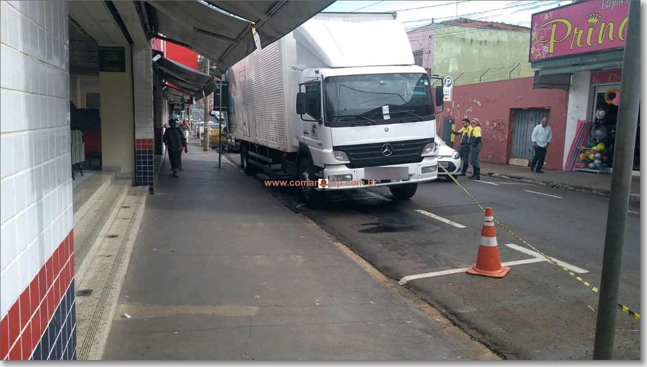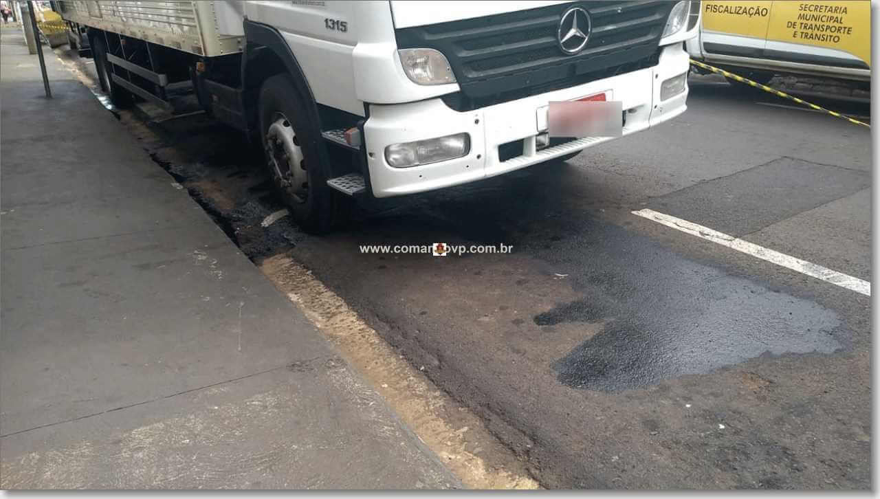 A Polícia Militar e Agentes de Trânsito abordaram um caminhão nesta manhã de terça-feira, 5 de fevereiro de 2019, na rua Episcopal, suspeito de estar derramando combustível pelas ruas de São Carlos e até causado acidentes.