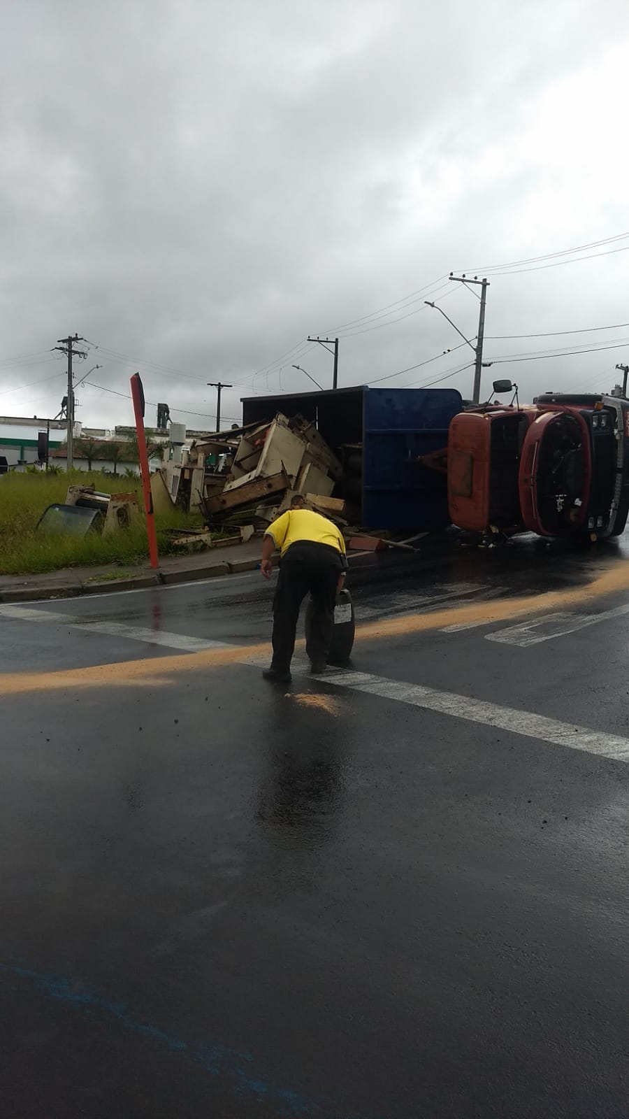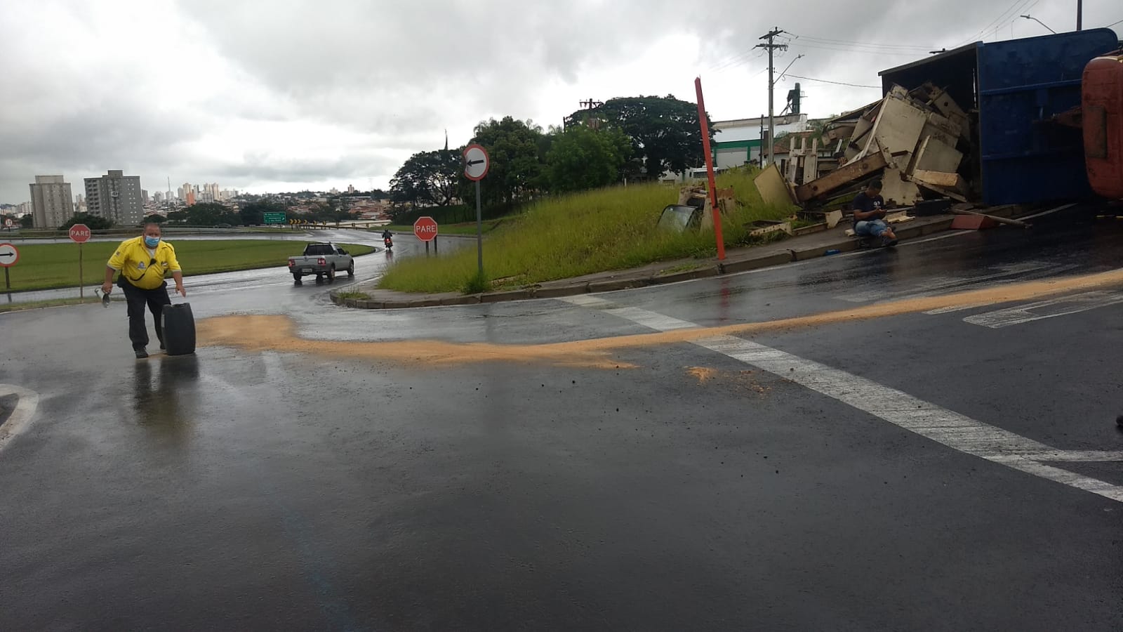 Um caminhão tombou nesta manhã de terça-feira, 1 de fevereiro de 2022, na alça de acesso da Avenida Getúlio Vargas, com a rodovia Washington Luís, região do Tenda, São Carlos-SP.