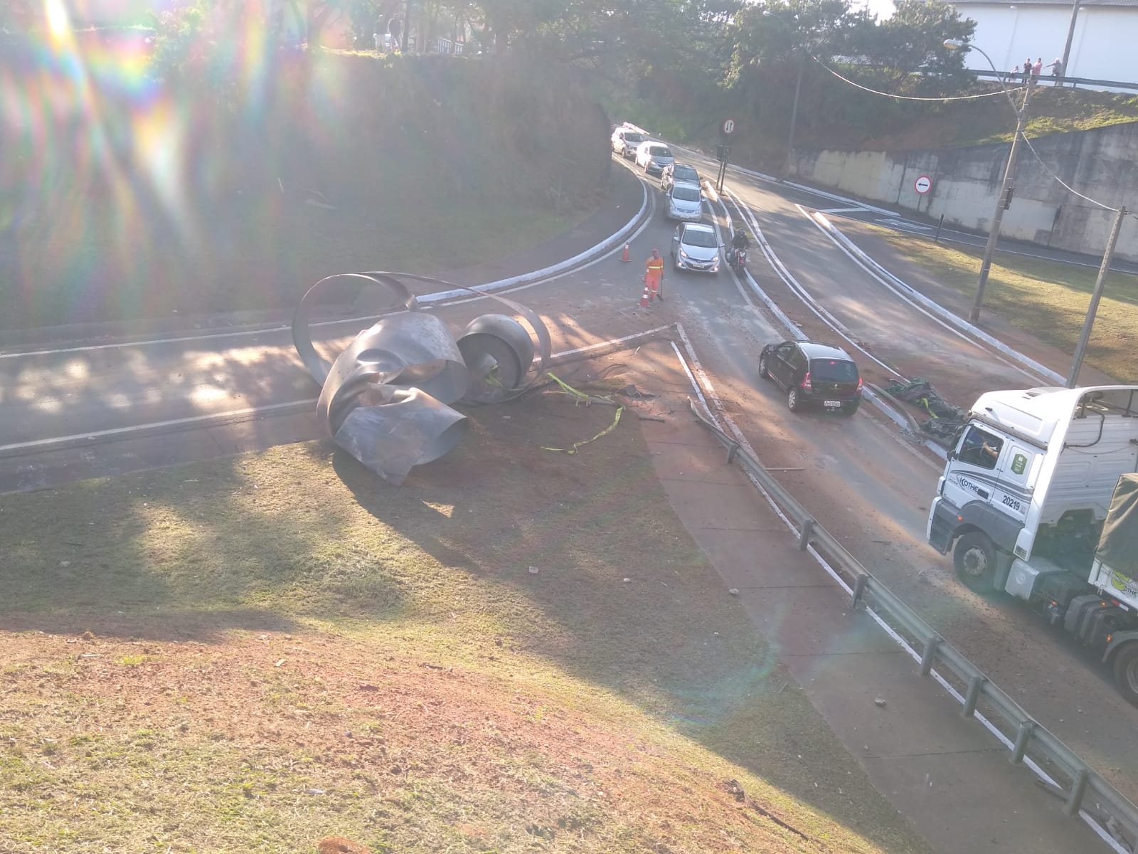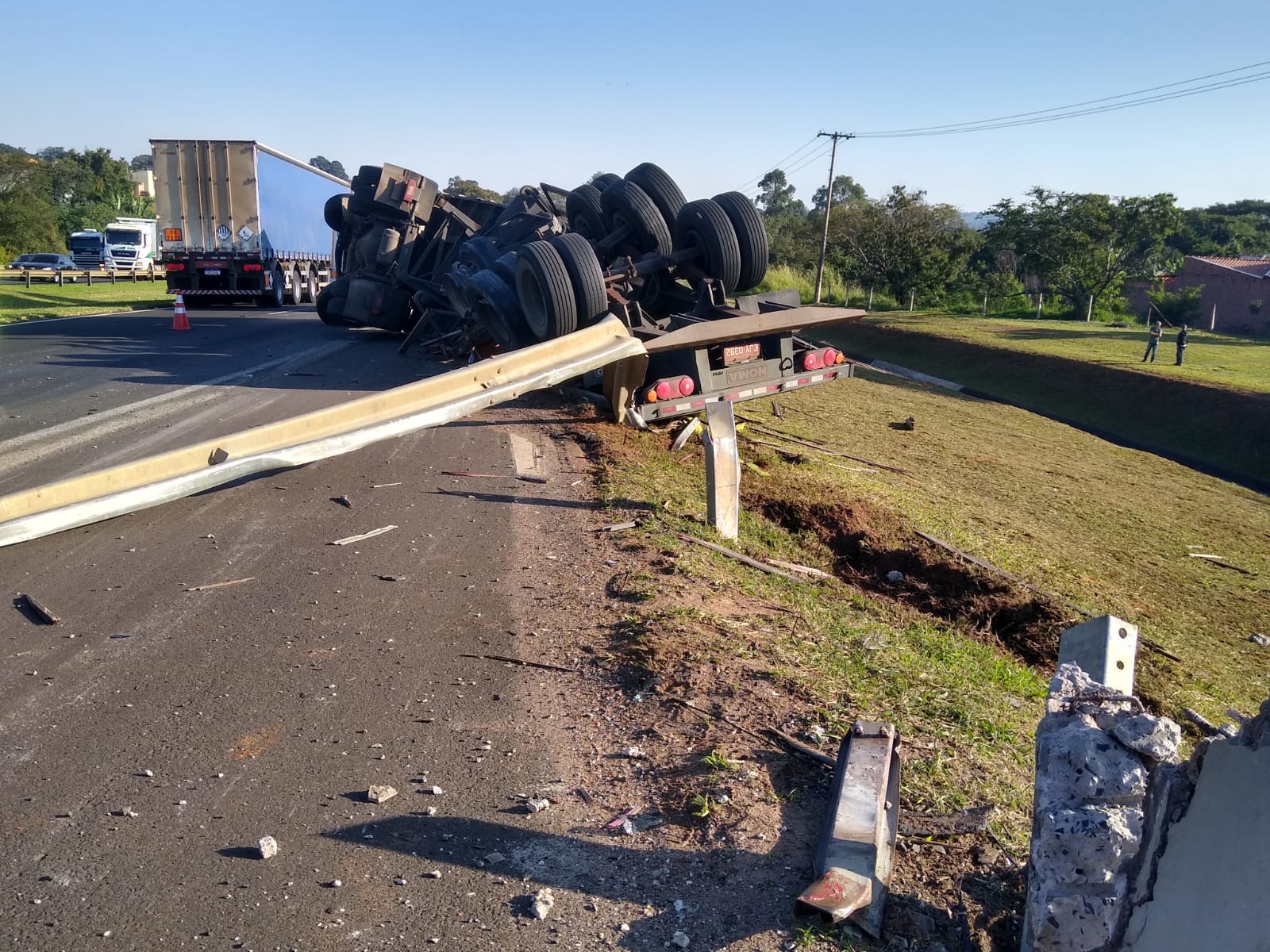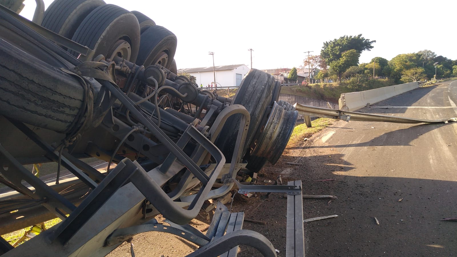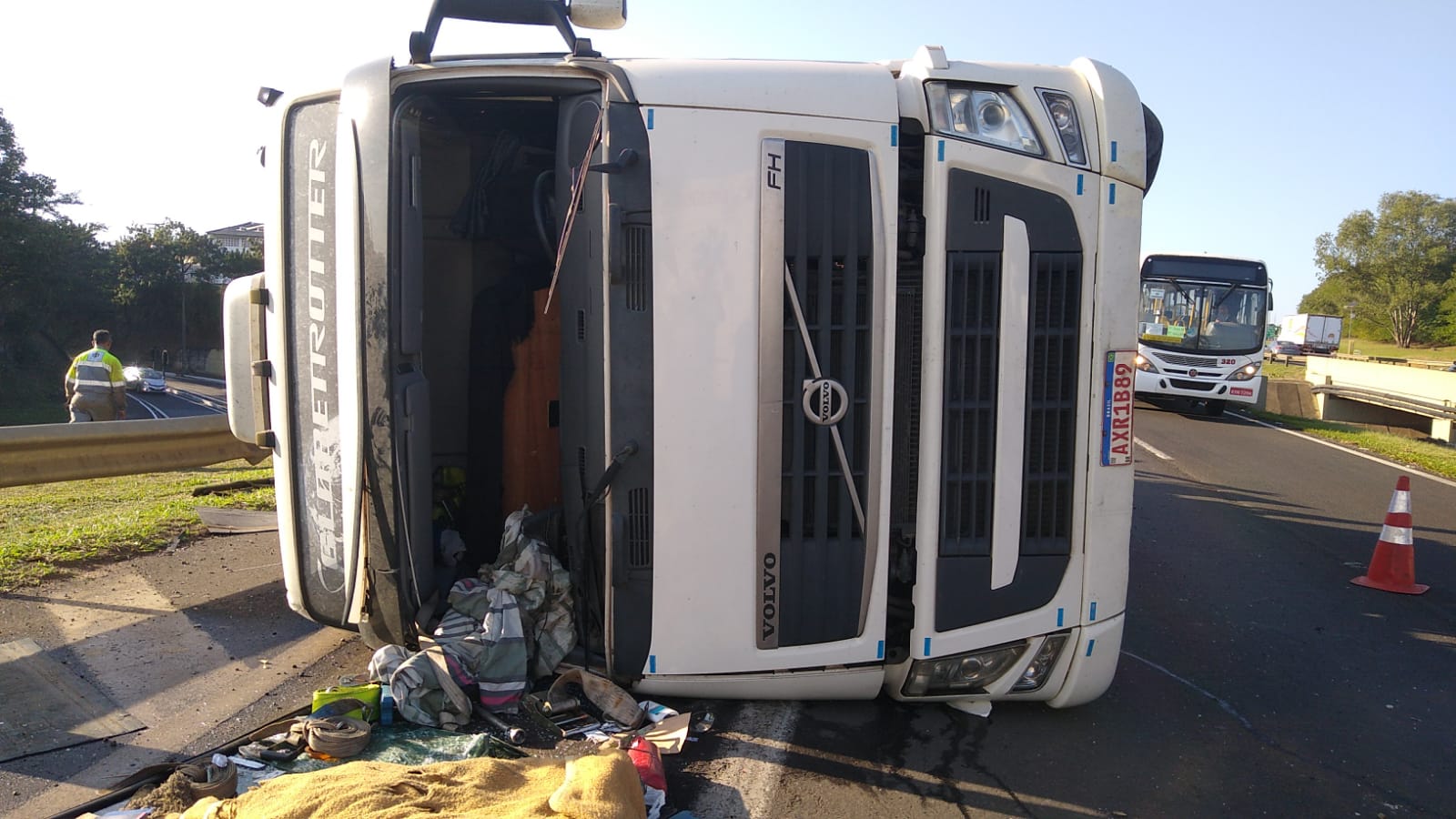 Um motorista de 32 anos saiu ileso de um tombamento de caminhão ocorrido por volta das 6:00 desta terça-feira, 21 de junho de 2022, na rodovia Washington Luís, região do bairro Maria Stela Fagá, São Carlos-SP.