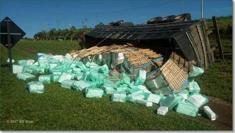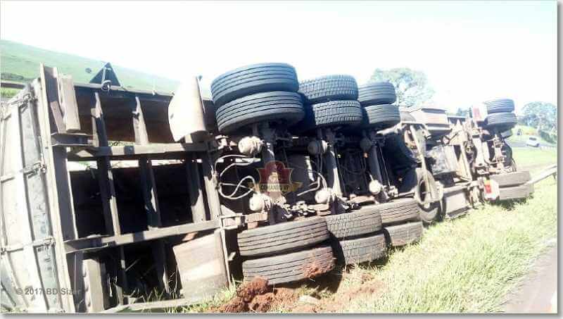 Segundo consta, no caminhão havia um casal e um garoto de 9 anos. O motorista foi desviar para não atingir a traseira do ônibus, mas sem êxito. O caminhão atingiu levemente ônibus e acabou tombando no acostamento. Apesar dos danos matérias, ninguém ficou ferido. Até a manhã deste sábado, a carga ainda estava espalhada e o caminhão tombado.