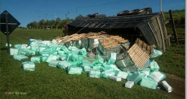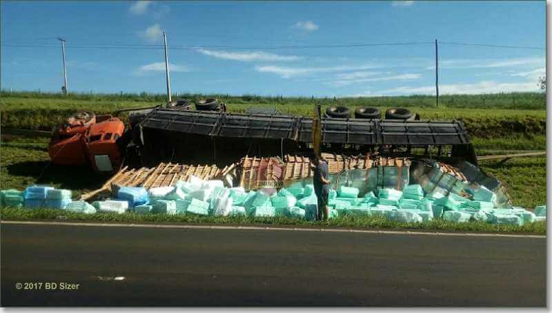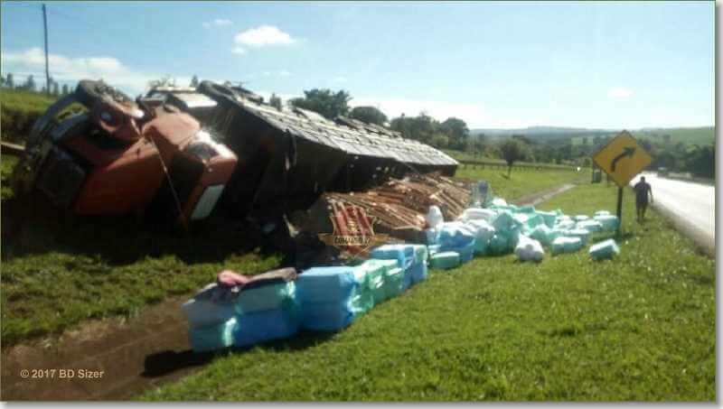 Durante a madrugada deste sábado,14-01-2017, a carga de um caminhão ficou espalhada no canteiro centra da rodovia Washington Luis, após um tombamento na descida do Chibarro, em Araraquara-SP.
