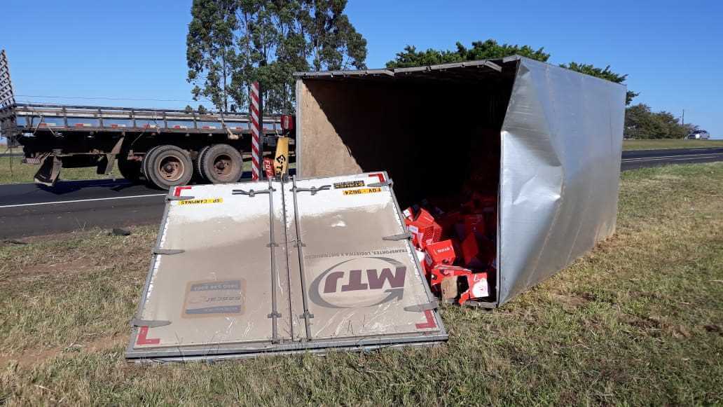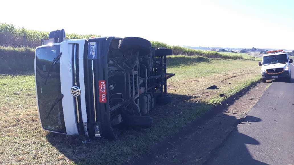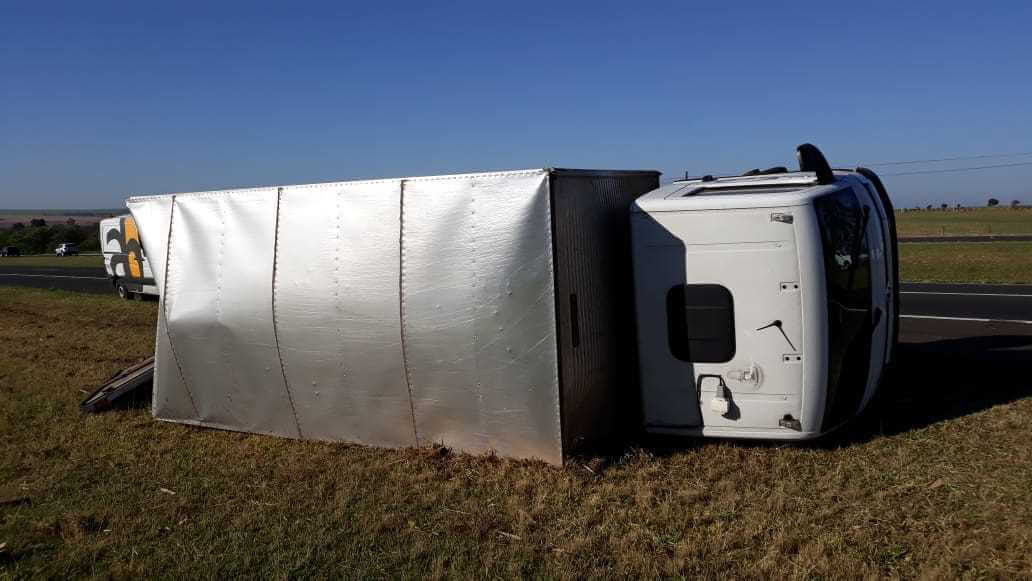 Um caminhão baú, placas de Campinas-SP,  capotou nesta manhã de terça-feira, 28 de abril de 2020, no km 245 da rodovia Washington Luís, entre Ibaté/São Carlos-SP.