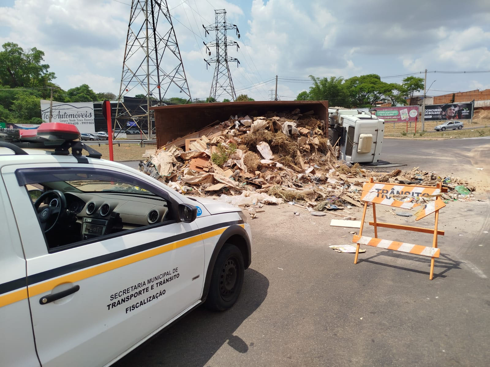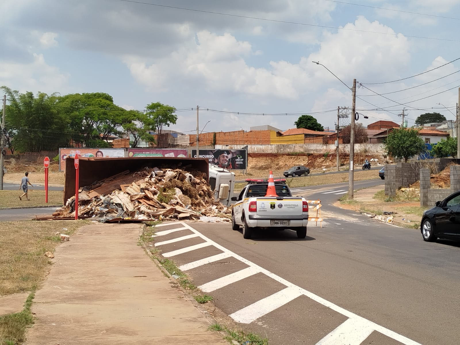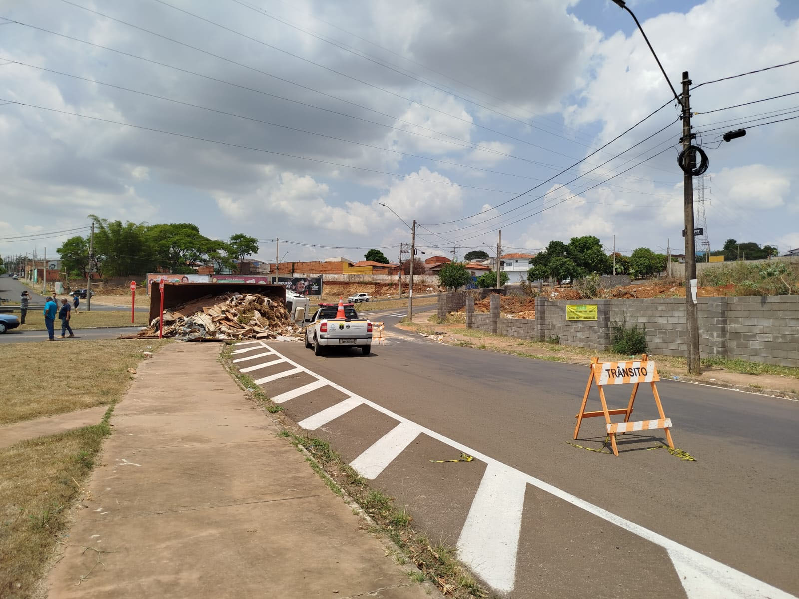 Nesta manhã de quarta-feira, 16 de outubro de 2024, um caminhão carregado com entulho tombou na Avenida Regit Arab, bairro Cidade Aracy, São Carlos-SP.