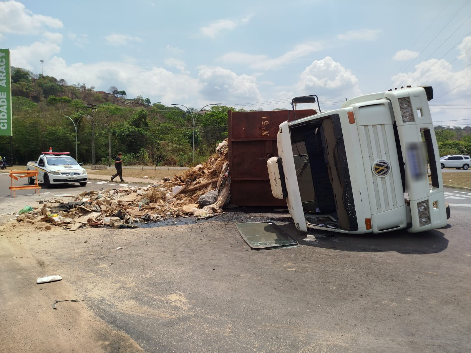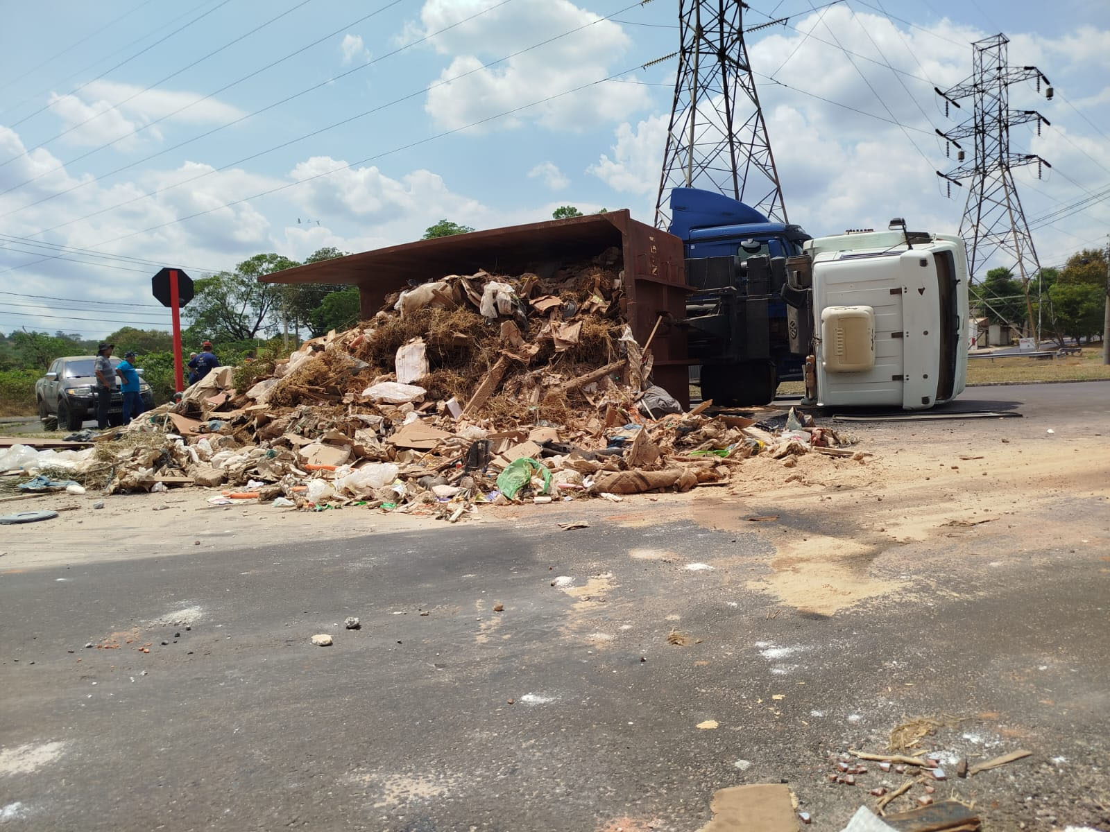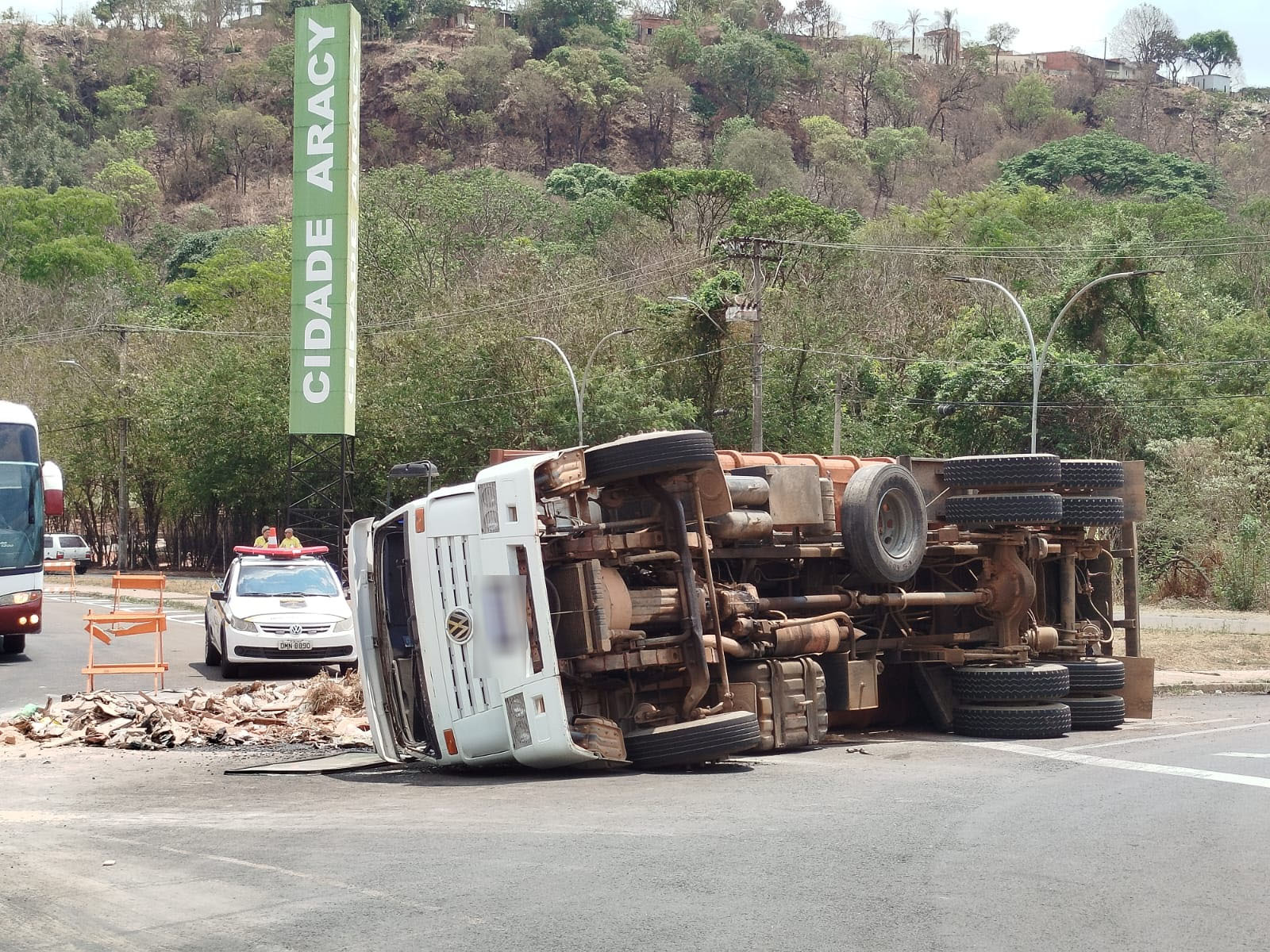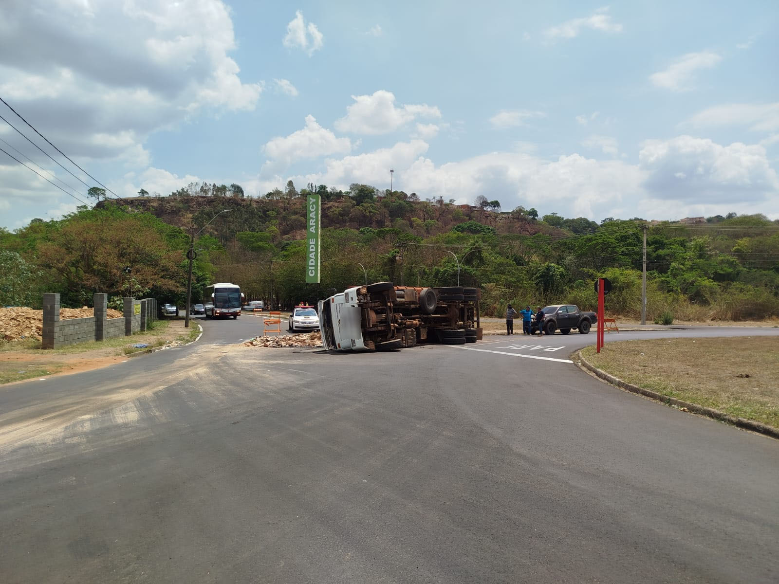Nesta manhã de quarta-feira, 16 de outubro de 2024, um caminhão carregado com entulho tombou na Avenida Regit Arab, bairro Cidade Aracy, São Carlos-SP.