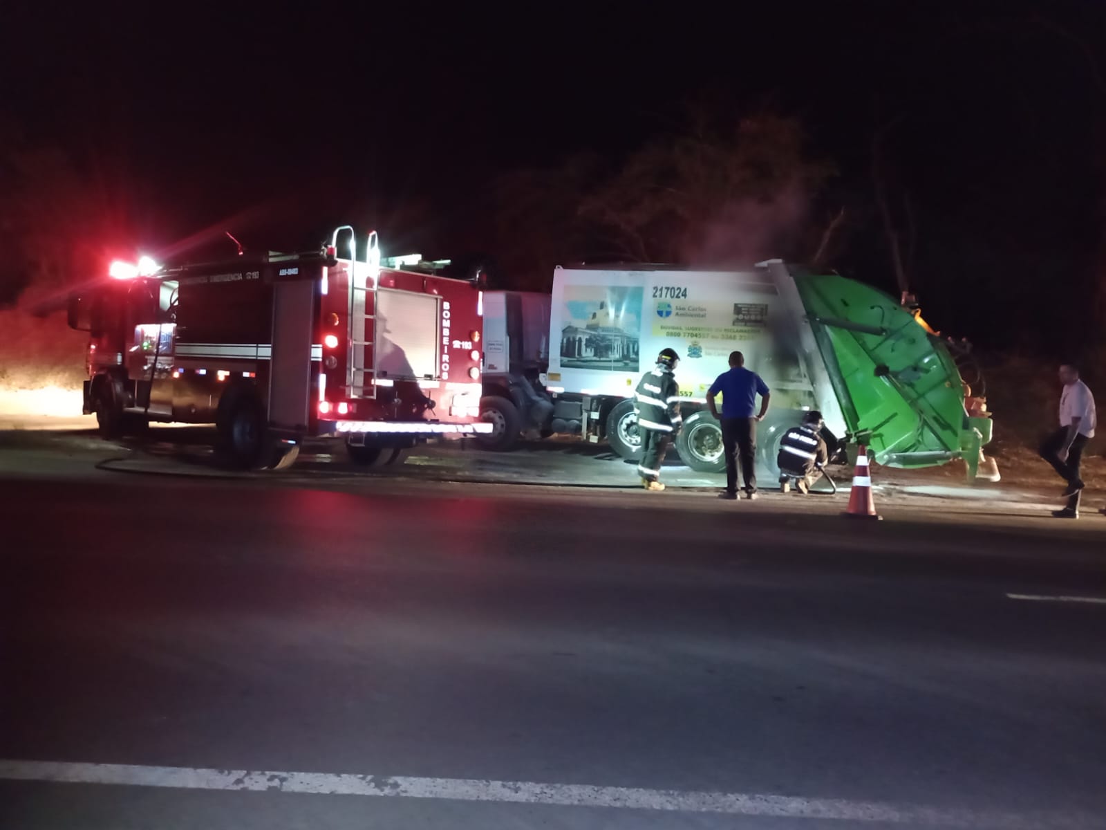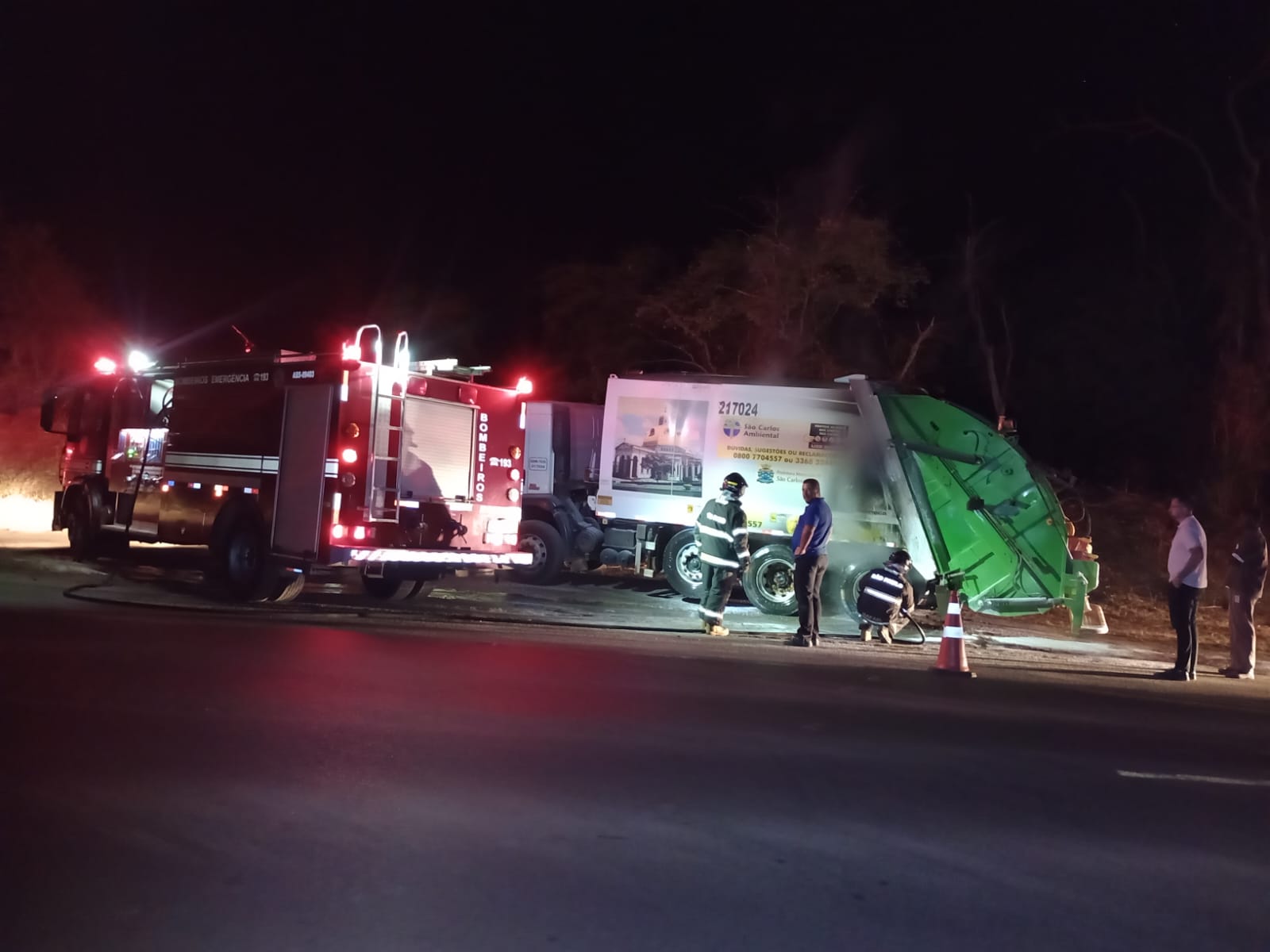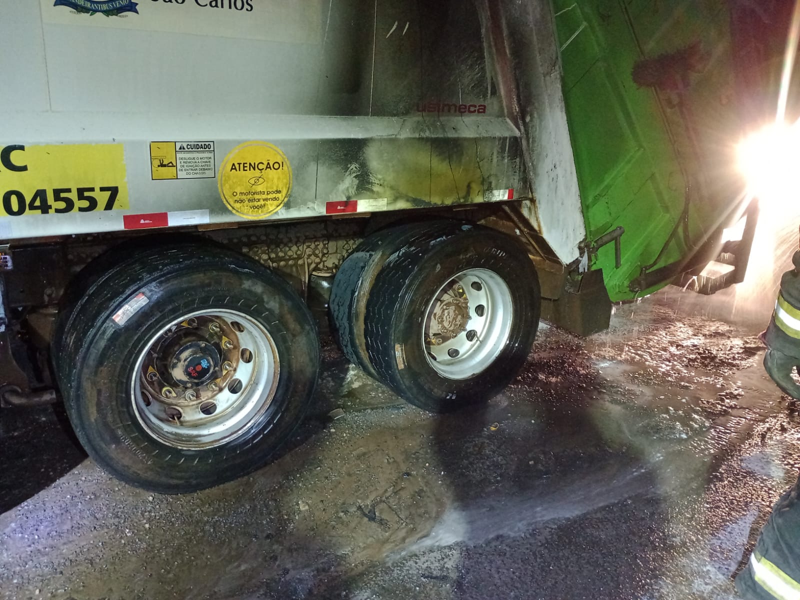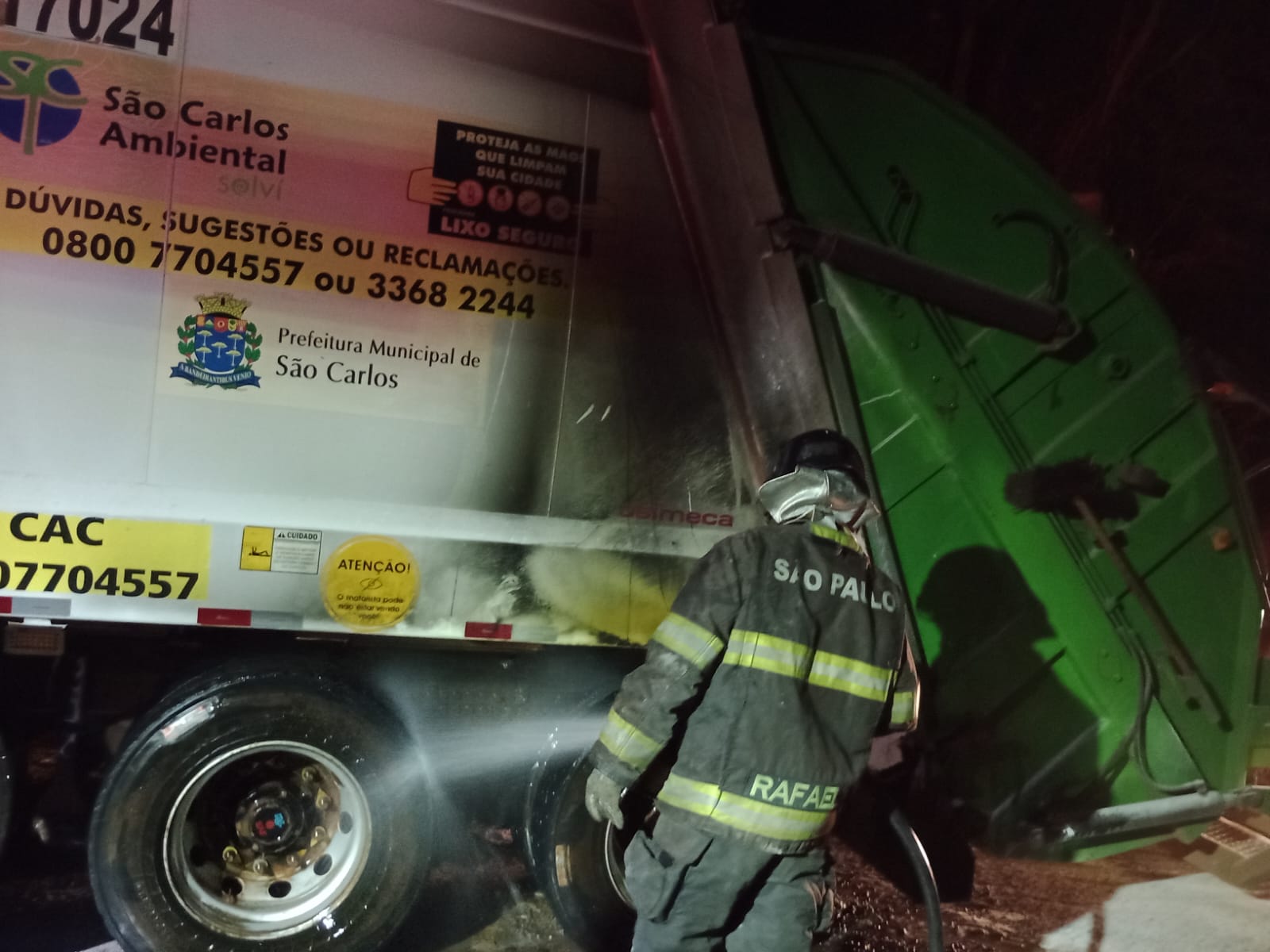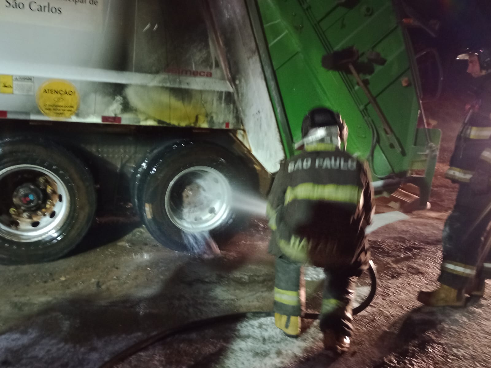 Um caminhão, o qual é usado para carregar lixo, sofreu um princípio de incêndio nesta noite de segunda-feira, 21 de agosto de 2023, na SP-215, entre São Carlos/ Ribeirão Bonito-SP.