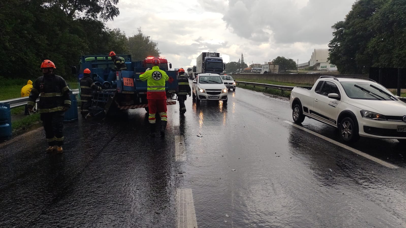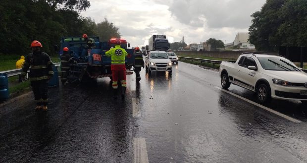 De acordo com informações, um caminhão carregado com botijões de gás foi atingido por um outro caminhão. O caminhão carregado com os botijões de gás, acabou batendo na defensa metálica e parte da carga caiu. Um homem nome e idade não informados, o qual estava no caminhão, ficou levemente ferido e foi socorrido pelo Corpo de Bombeiros e encaminhado para a Santa Casa. A Polícia Rodoviária esteve no local e tomou as medidas cabíveis.