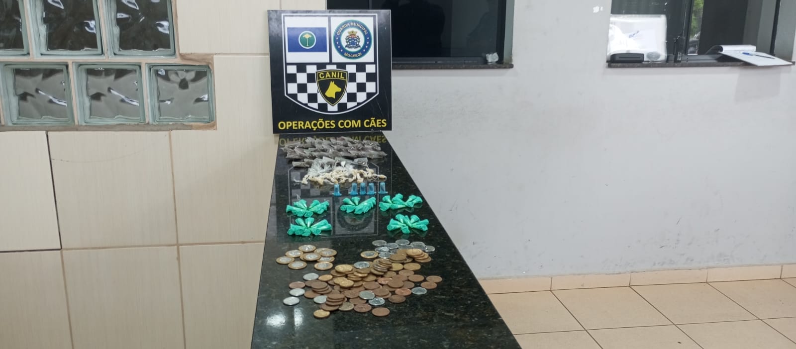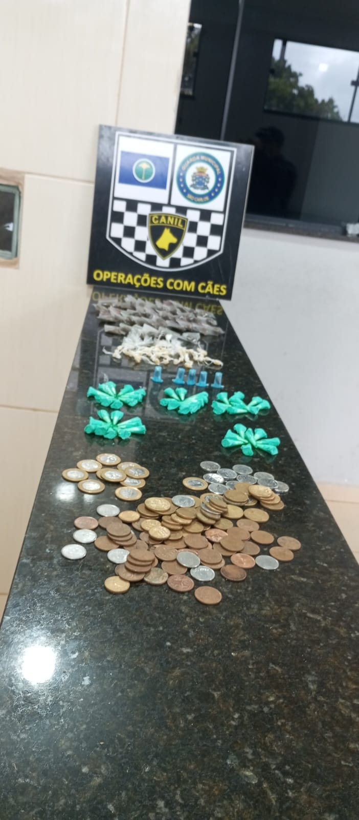 De acordo com informações, a GM estava em patrulhamento quando abordou dois suspeitos. Com eles nada de ilícito foi localizado, porém em um terreno baldio, em meio ao mato alto, o cão farejador encontrou uma sacola contendo 52 pedras de crack, 48 pinos de , 05 de haxixe, 36 invólucros de maconha e R$ 27,55. A ocorrência foi encaminhada para a Central de Polícia Judiciária, onde foram apreendidos as drogas e o dinheiro.