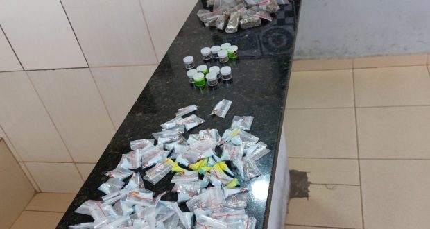 De acordo com informações, o Canil estava em patrulhamento, quando avistou um indivíduo. Este saiu correndo e não foi abordado. Em cima de um telhado, foram localizados 120 pinos de cocaína, 38 invólucros de maconha e 12 porções de Skank. As drogas foram apreendidas na Central de Polícia Judiciária.