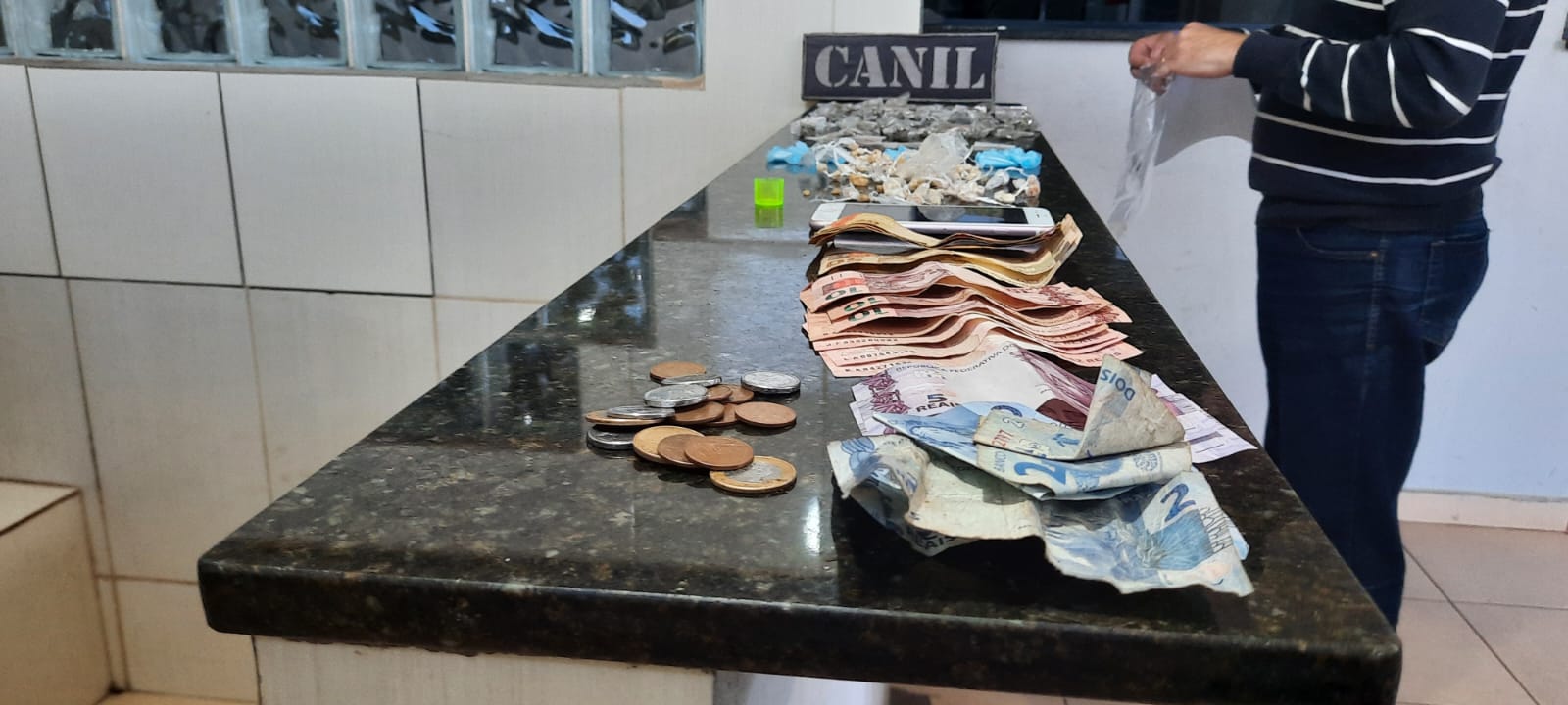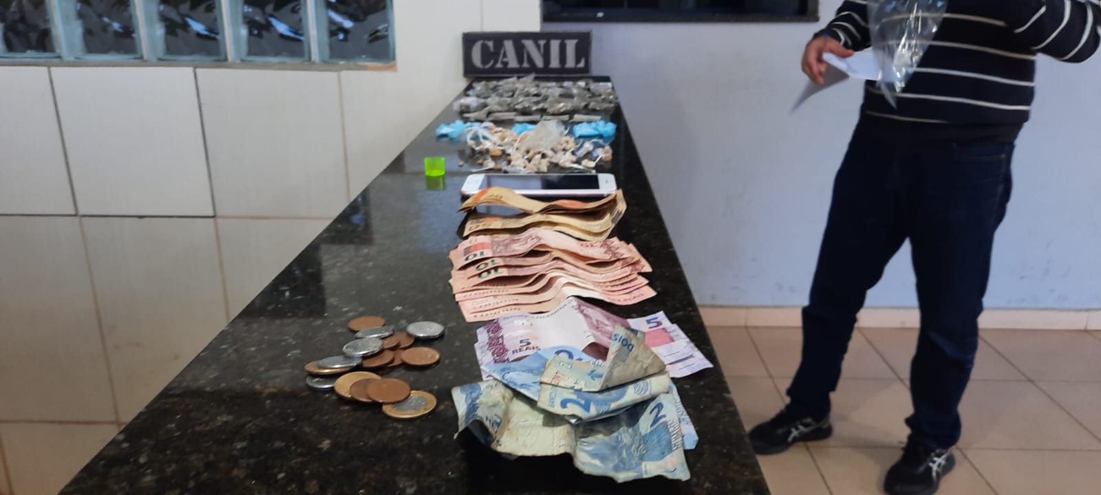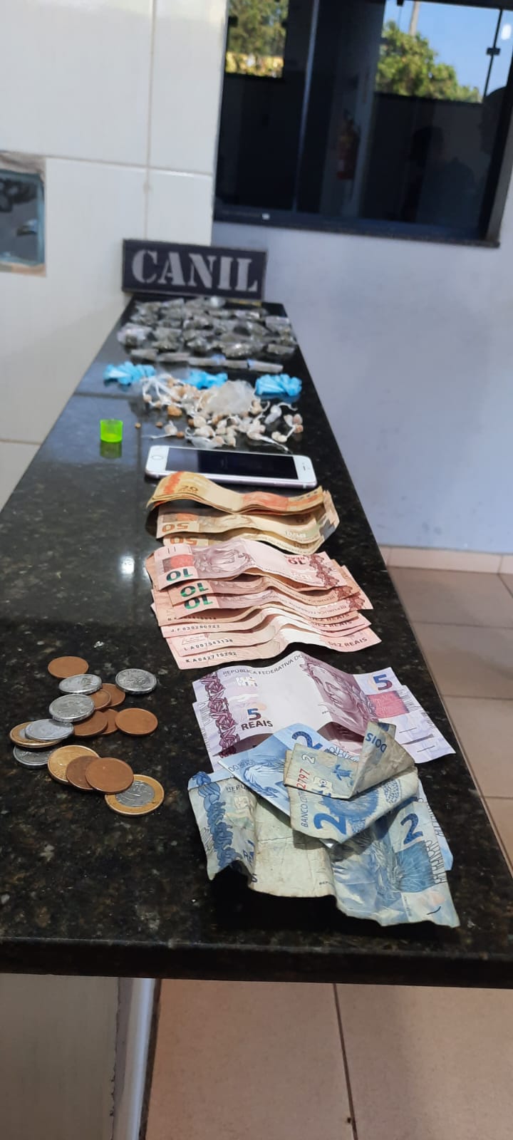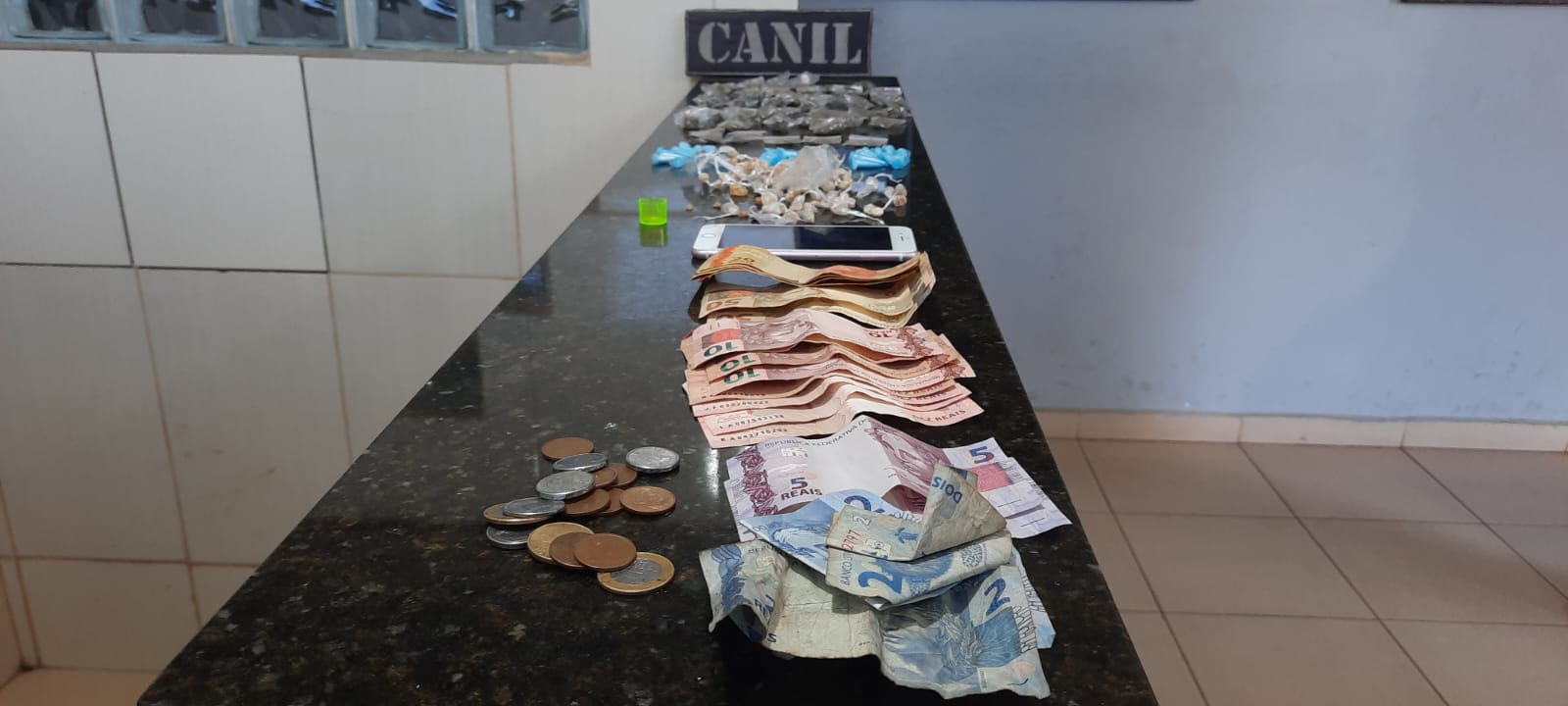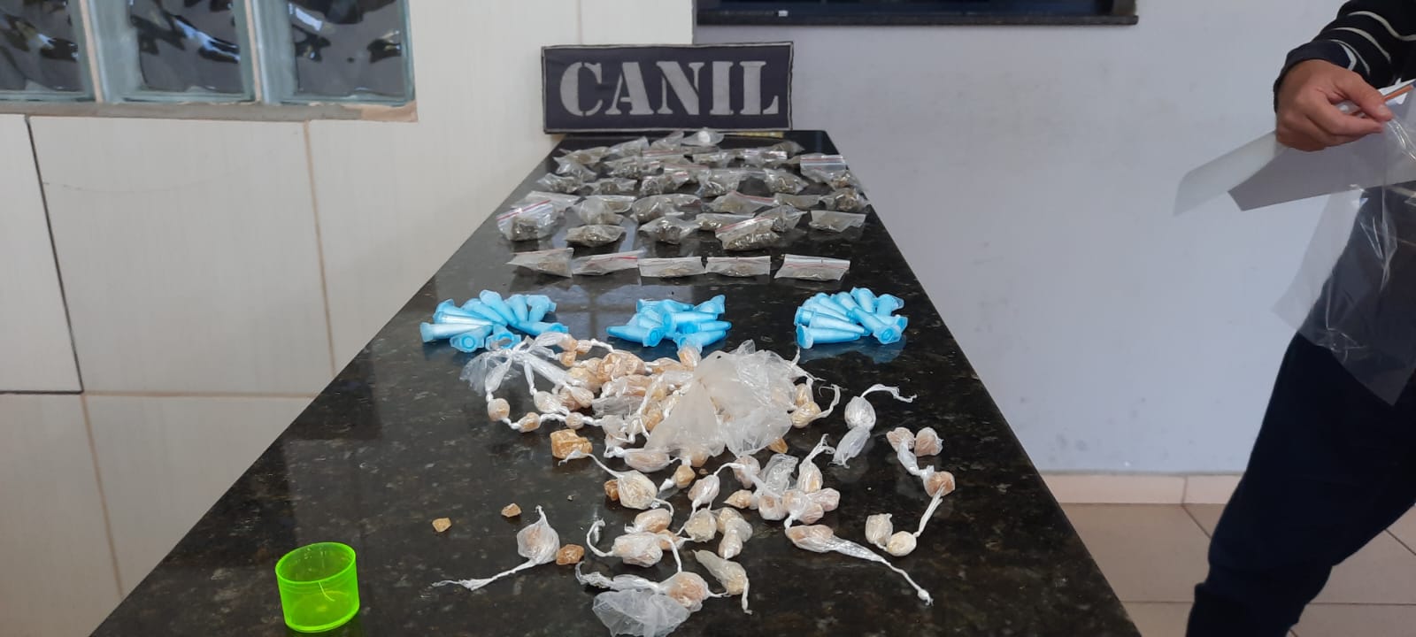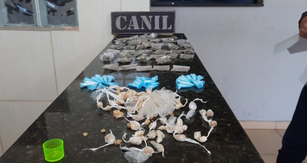 De acordo com informações, o Canil da GM estava em patrulhamento preventivo, quando avistou um indivíduo L.D.O, 18 anos, que ao perceber a aproximação, dispensou uma sacola contendo 86 pedras de crack, 40 porções de maconha, 30 pinos de cocaína, 01 haxixe, 5 skank , R$ 283,40 e um celular. O sujeito foi detido e encaminhado para a Central de Polícia Judiciária, onde ficou à disposição da justiça.