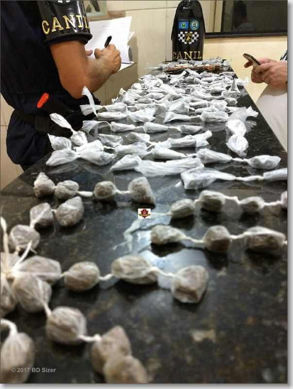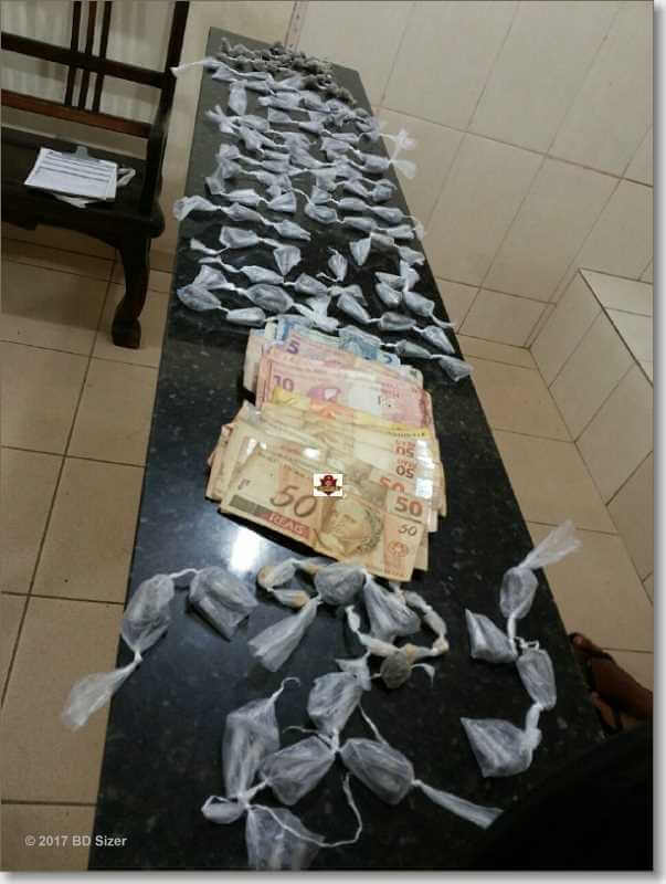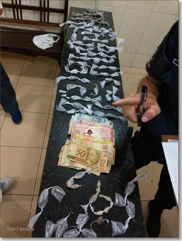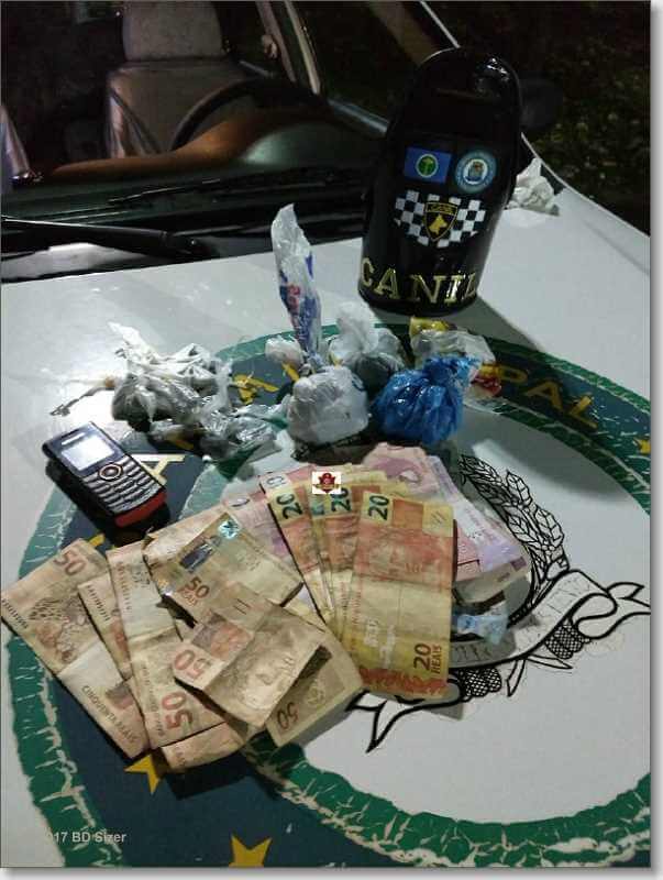 Guardas municipais estavam em patrulhamento quando avistaram 5 jovens, os quais foram abordados, porém 4 foram liberados, pelo fato do menor de 17 anos assumir ser o dono da droga. No total foram localizadas 28 porções de maconha, 11 pedras de crack, 176 pinos cocaína dinheiro R$ 616,00.