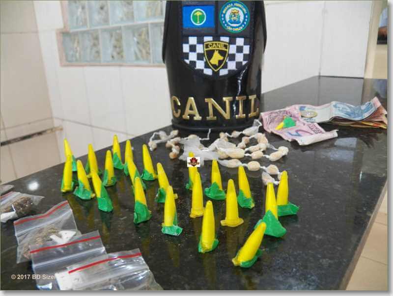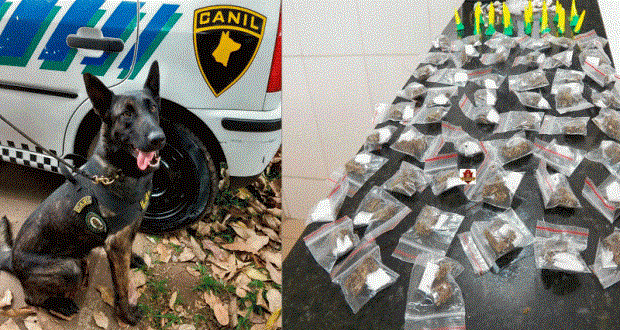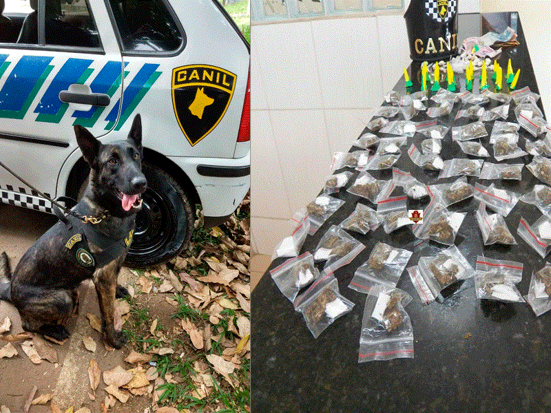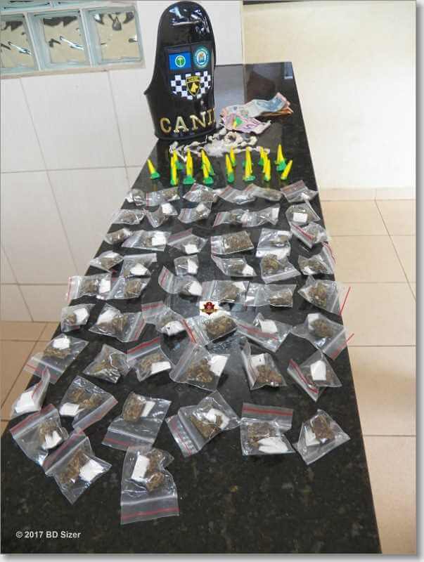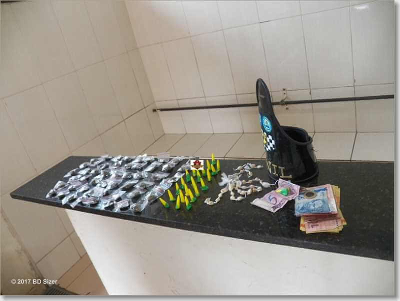 Segundo informações, o local já é conhecido como ponto de tráfico. Uma guarnição da GM passava pelo local quando se deparou com o menor. Ele foi abordado e em seu poder foi localizado um pino de droga e a quantia de cinco reais. A cadela Layka desceu da viatura e começou a farejar o local. Debaixo de um amontoado de entulhos foram localizados 51 porções de maconha, 33 pedras de crack, 23 pinos de cocaína e R$ 315,00.  O adolescente, o qual segundo consta, costuma vender drogas nas proximidades, foi encaminhado ao Plantão Policial, ficando à disposição da autoridade policial