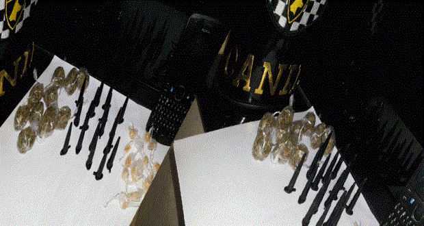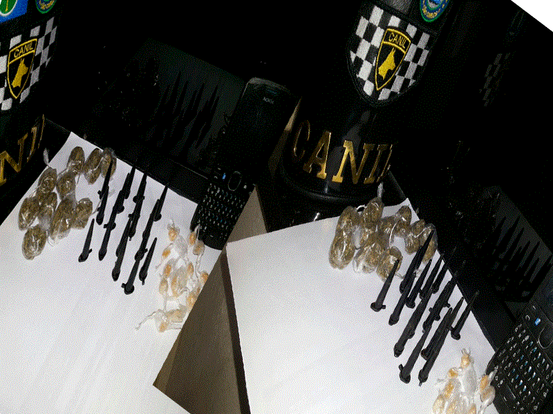 Segundo informações, a GM estava fazendo patrulhamento perto da escola Guildinei Carrera, quando abordou um indivíduo. Ao ser questionado o que estava fazendo ali naquele local, disse estar tomando pinga, porém não tinha pinga alguma. Um 2º suspeito foi abordado e com este foi localizada uma pedra de crack. Cerca de 2 metros da abordagem a cadela Layka localizou debaixo grama seca pedras de crack, no pé de uma árvore , dentro de um buraco foram localizados pinos com cocaína, debaixo de uma telha porção de maconha. No total foram encontrados 14 pedras de crack, 17 pinos de cocaína e 10 porções de maconha.A dupla foi conduzida ao Plantão Policial, qualificada e liberada.