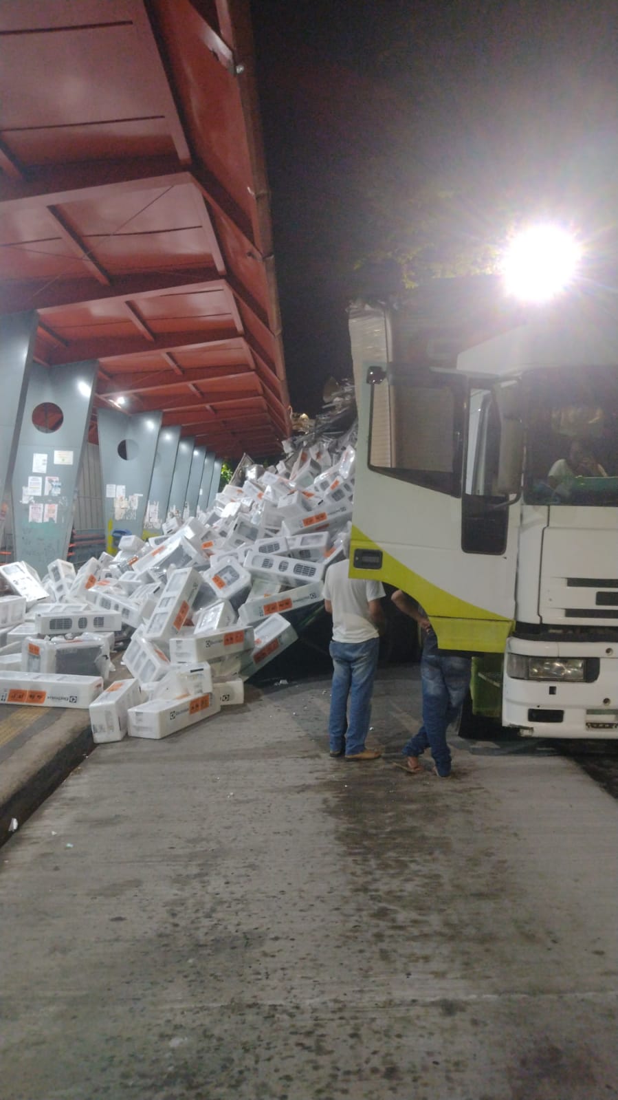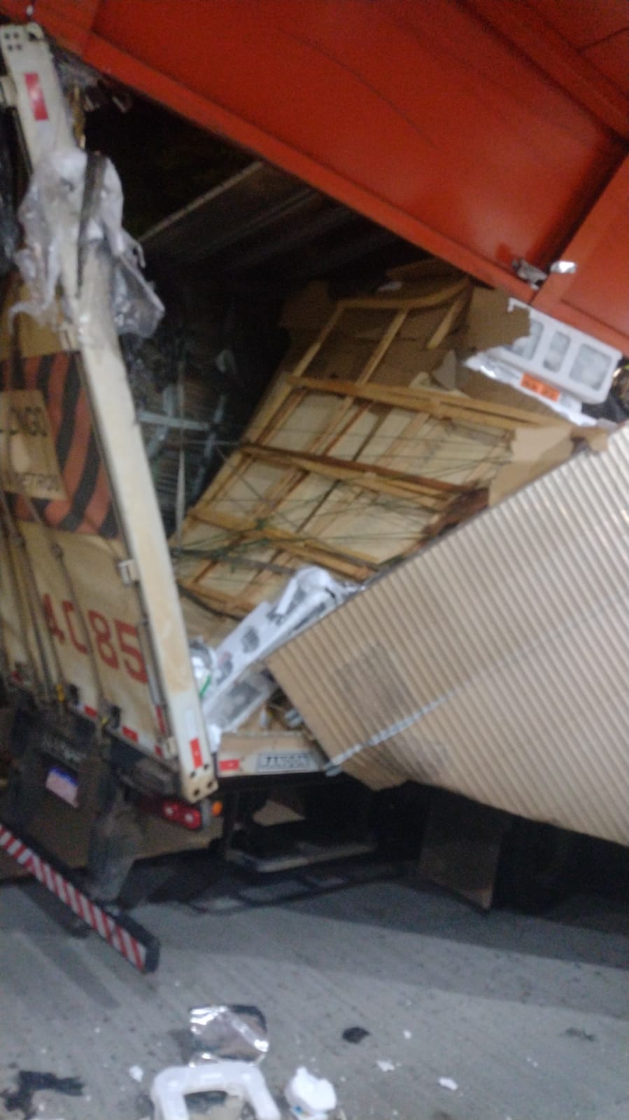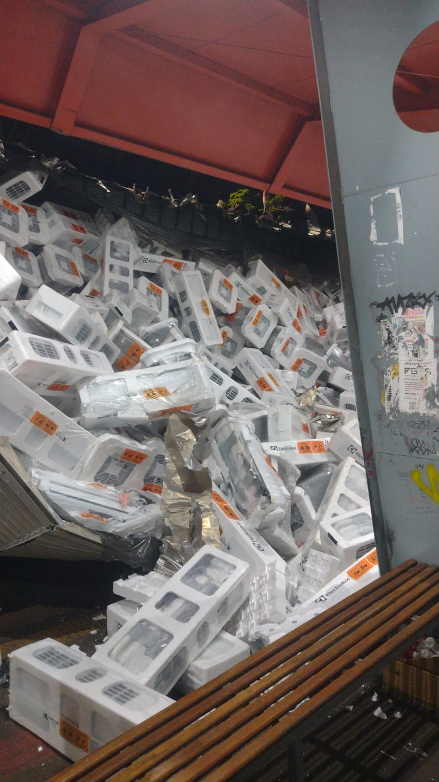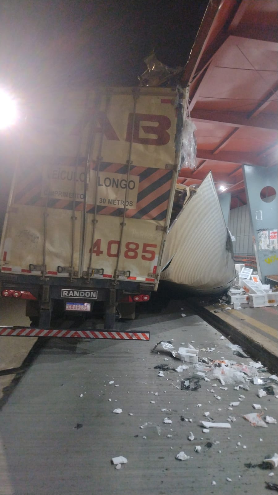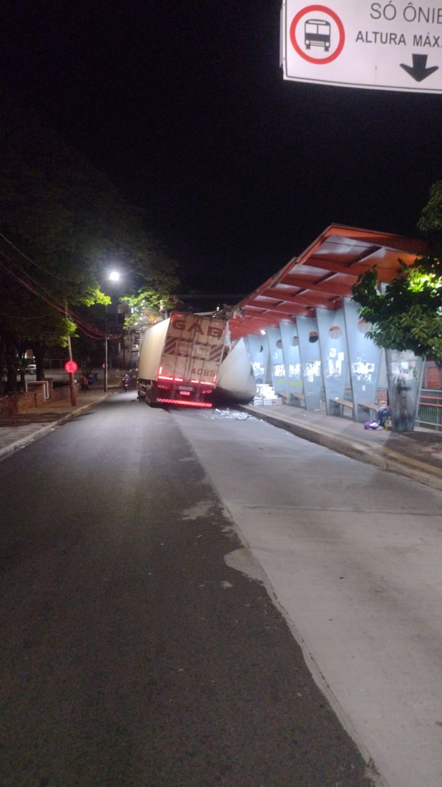 Segundo informações, o motorista do caminhão desviou de um carro, a parte superior bateu na cobertura do ponto de ônibus e rasgou a carroceria. A carga de ar-condicionado ficou espalhada no ponto do coletivo. A PM foi acionada e tomou as medidas cabíveis. Ninguém focou ferido.