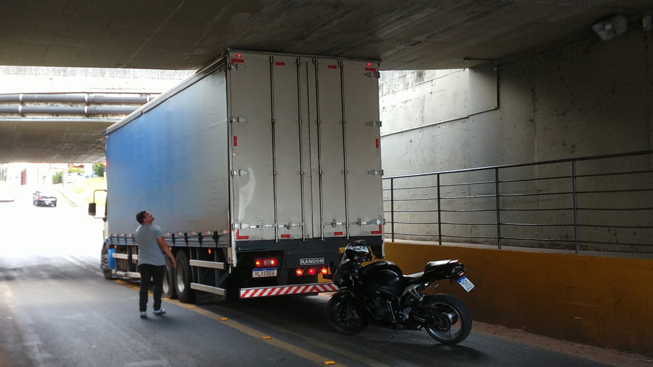 Uma carreta ficou presa nesta manhã de quarta-feira, 14/04/2021, no Pontilhão do Santa Maria, São Carlos-SP.