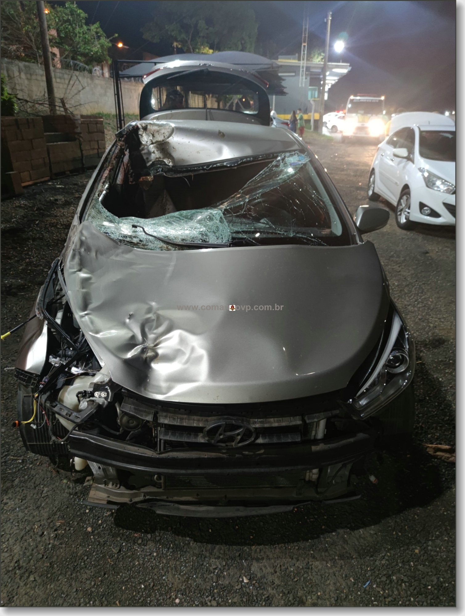 Um veículo Hb20 Hach Premium, placas de São Carlos, ficou completamente destruído após atropelar e matar uma vaca na noite de domingo, 17-10-2021 na SP-215, região do bairro Cidade Aracy, São Carlos-SP.