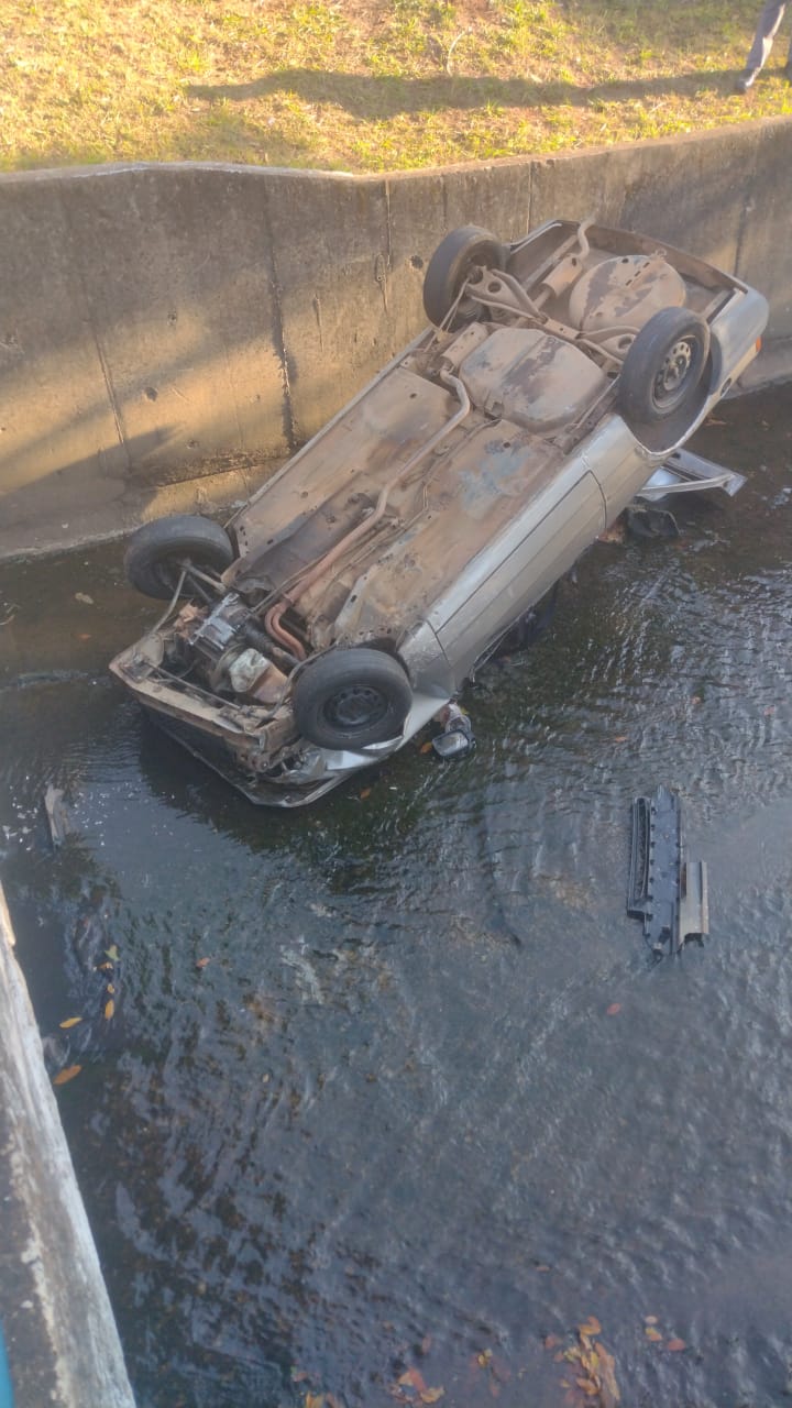 Início » Destaque » Carro cai em córrego e fica com as rodas para cima