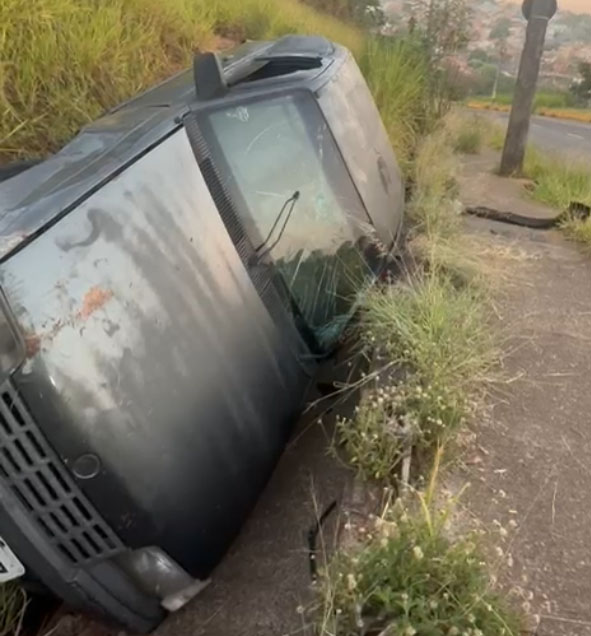 Um veículo Kadett foi parar em uma vala nesta madrugada de sábado, 15 de março de 2025, na serra do bairro Cidade Aracy, São Carlos-SP.