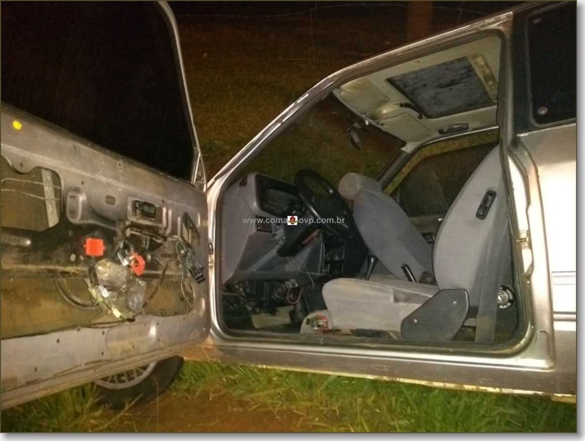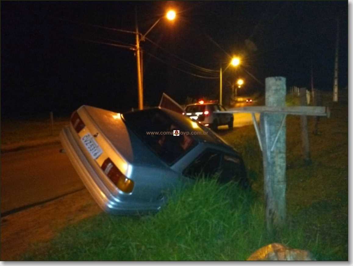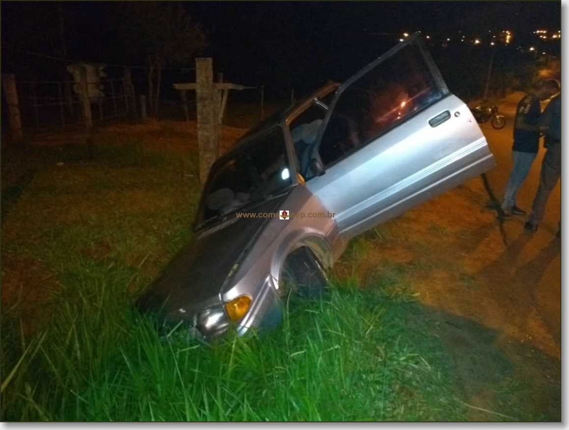 A PM foi acionada para o local e testemunhas relataram que eram três sujeitos que estavam no veículo. O condutor perdeu o controle da direção e caiu no buraco. O carro estava com ligação direta, faltando alguns equipamentos, mas não tinha queixa de furto ou roubo. O mesmo foi recolhido ao Pátio Municipal.