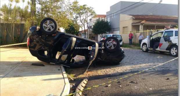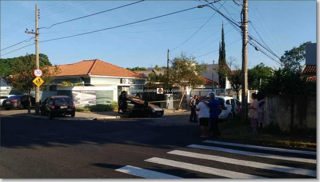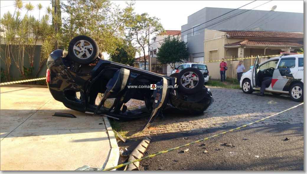 Com o impacto, o carro Renault/Duster capotou. Duas crianças, de 7 e 6 anos, e um adulto, estavam dentro do carro.