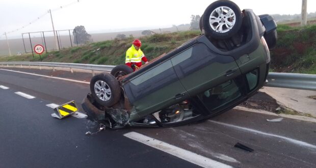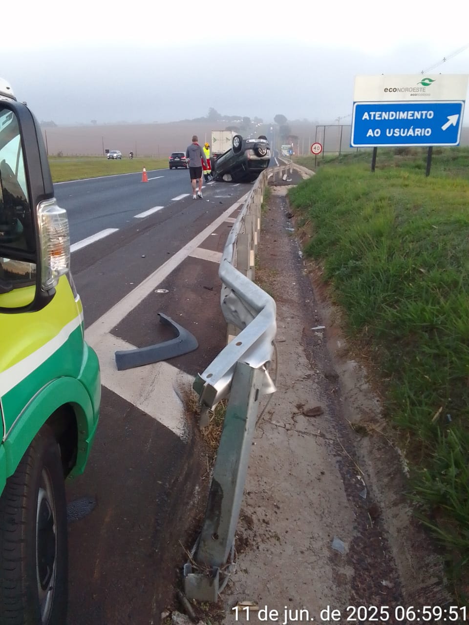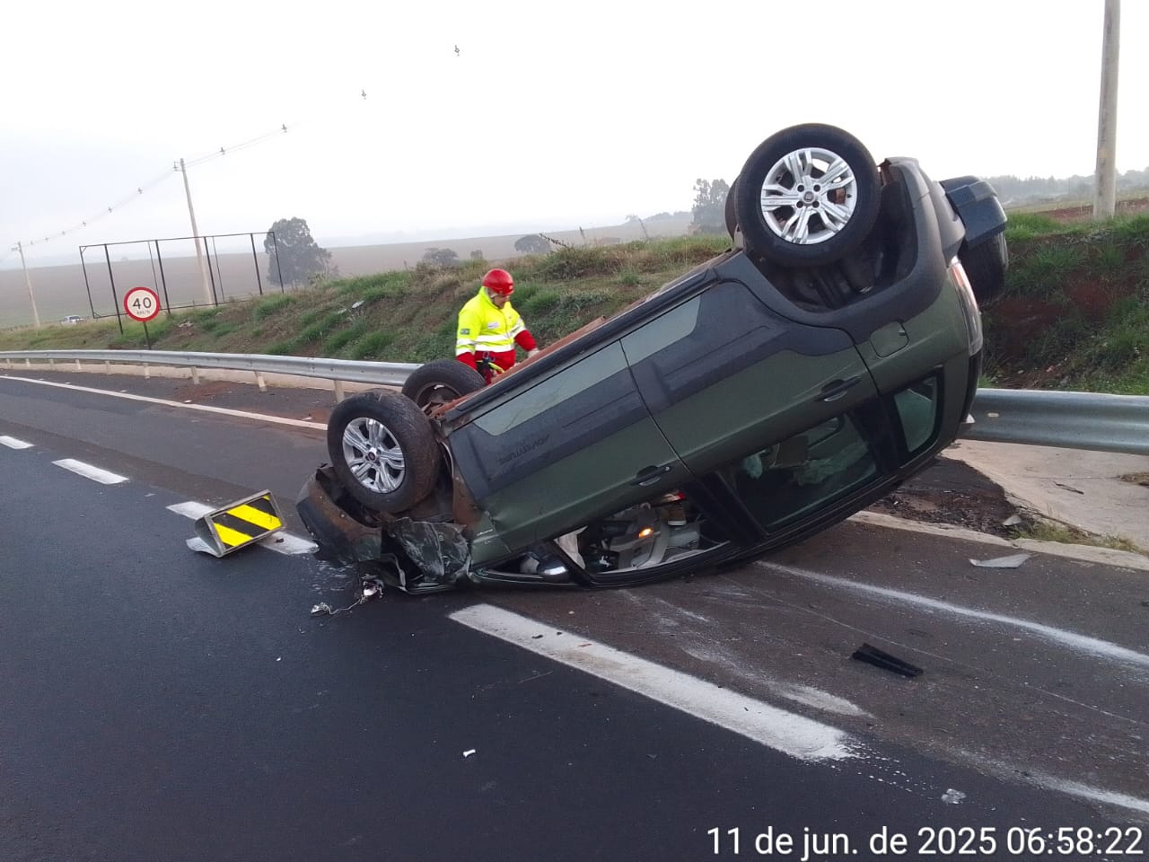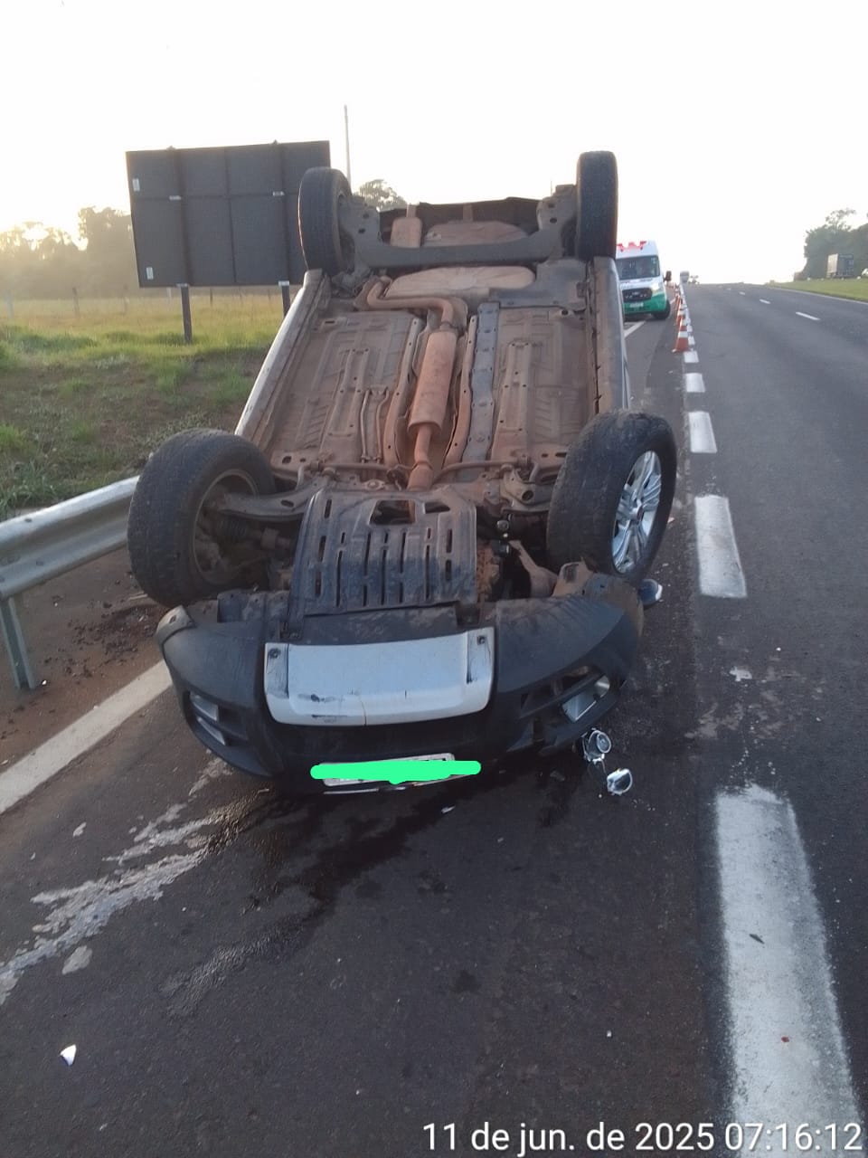 Um carro capotou nesta manhã de terça-feira, 11-06-2025, na rodovia Washington, região do posto Nossa Senhora de Fátima, São Carlos-SP.