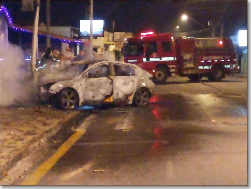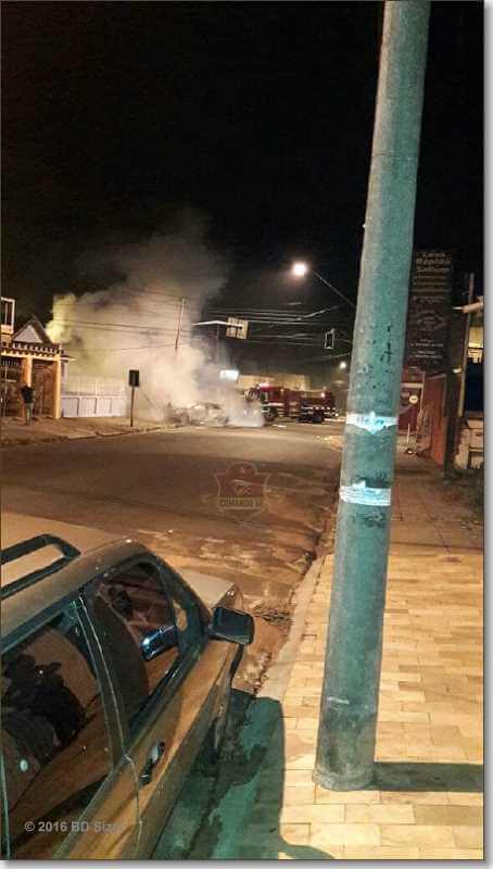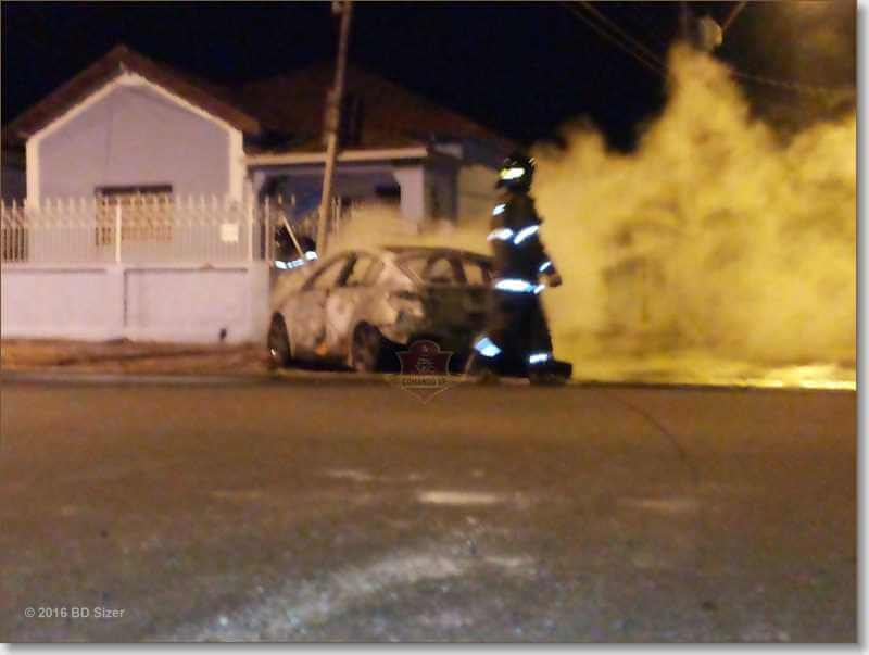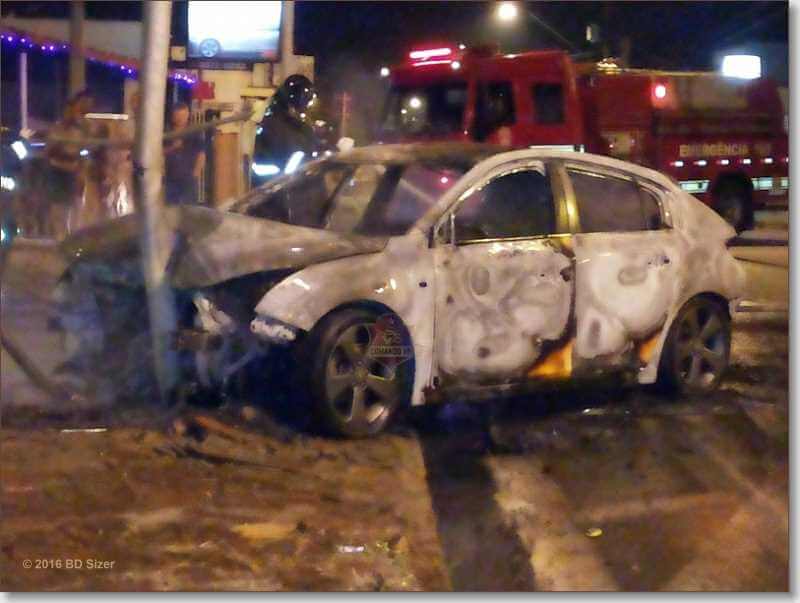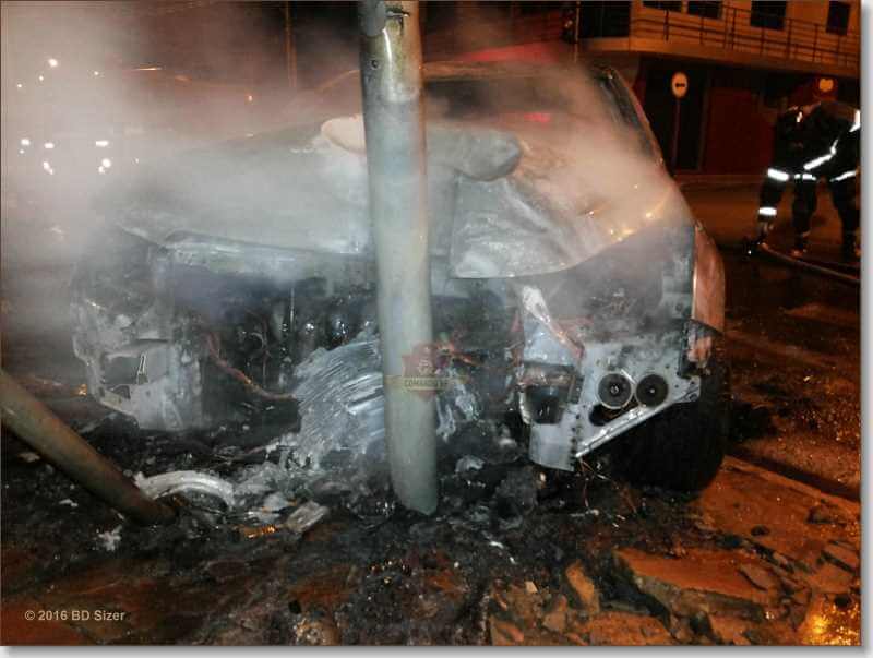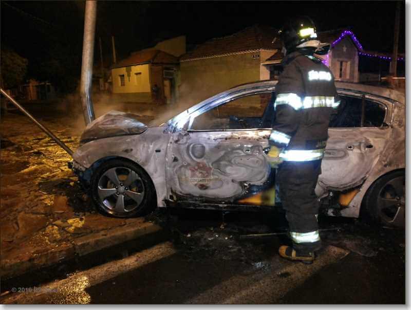 Um carro foi destruído por chamas após colidir em um poste por volta das 4:50 deste sábado, 26-11-2016, na rua Cândido do Padim, cruzamento com Avenida Sallum, bairro Vila Prado, São Carlos-SP.