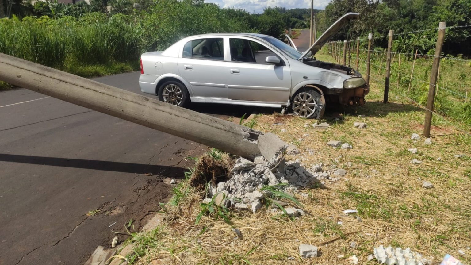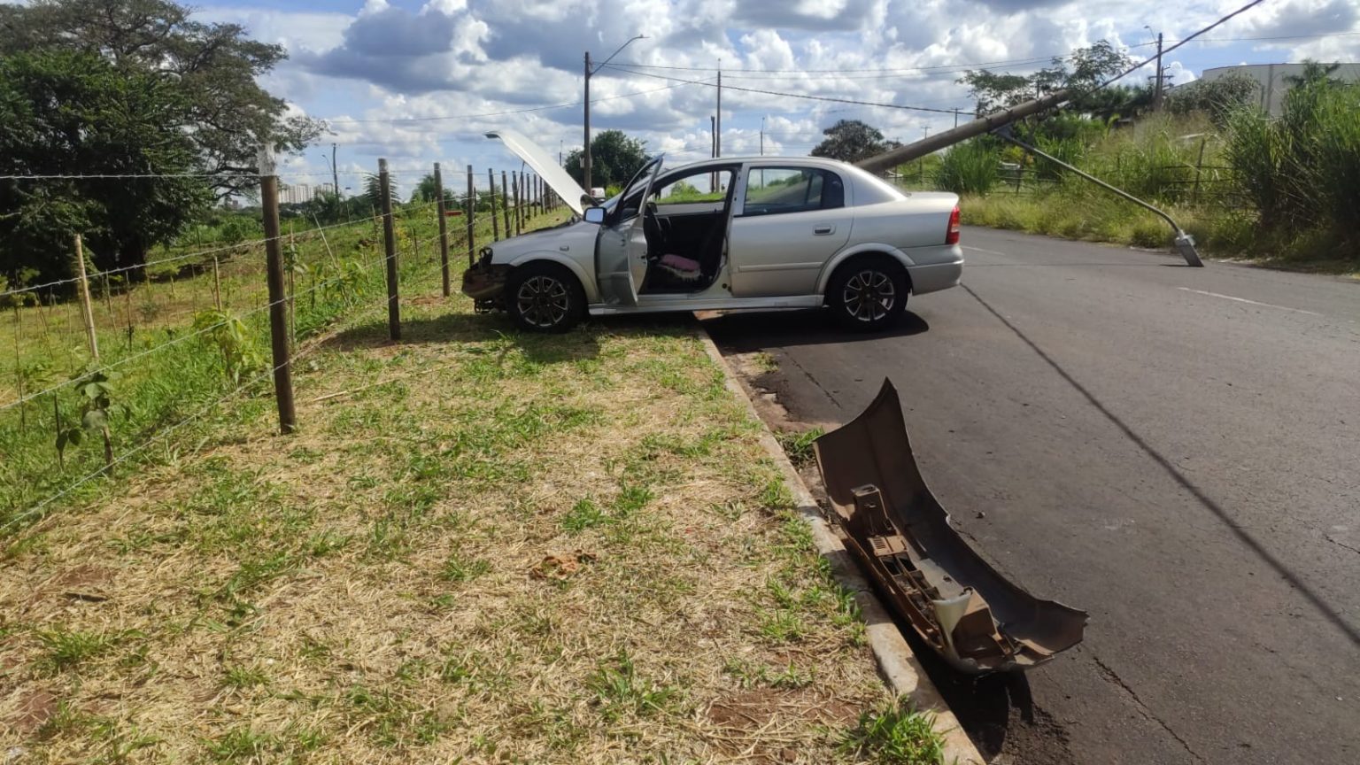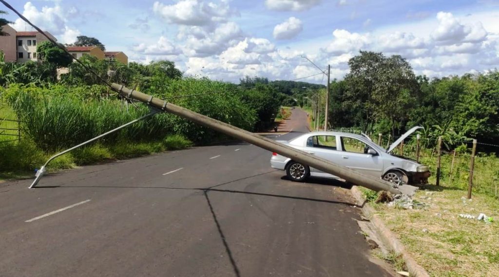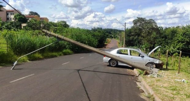 Um veículo desgovernado bateu em um poste de iluminação pública, no Jardim Paraíso, em Araraquara-SP, na tarde desta quarta-feira (8).