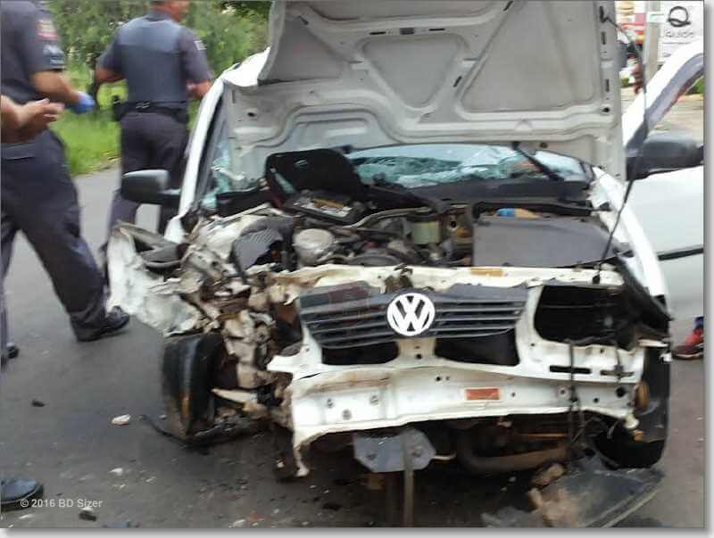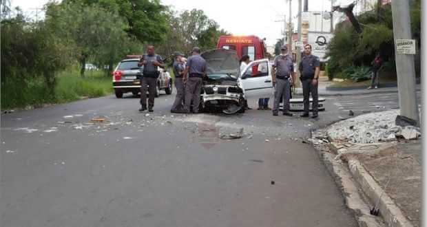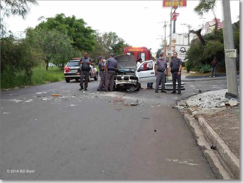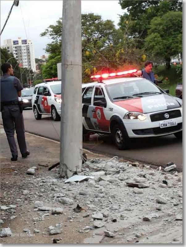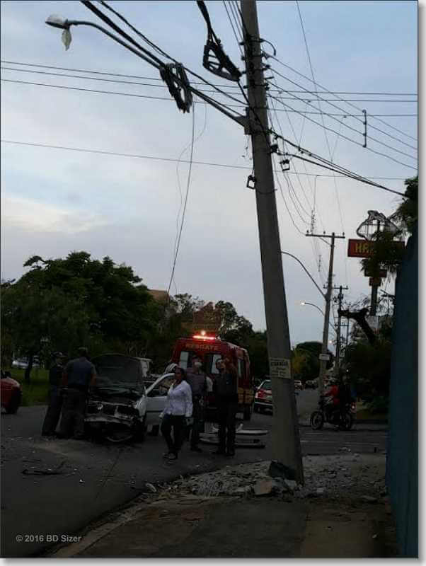 No inicio da noite desta quinta-feira, 01-12-2016, um carro teve sua frente destruída ao colidir em um poste na Avenida Trabalhador São-carlense, região do Campus Um da USP, São Carlos-SP.