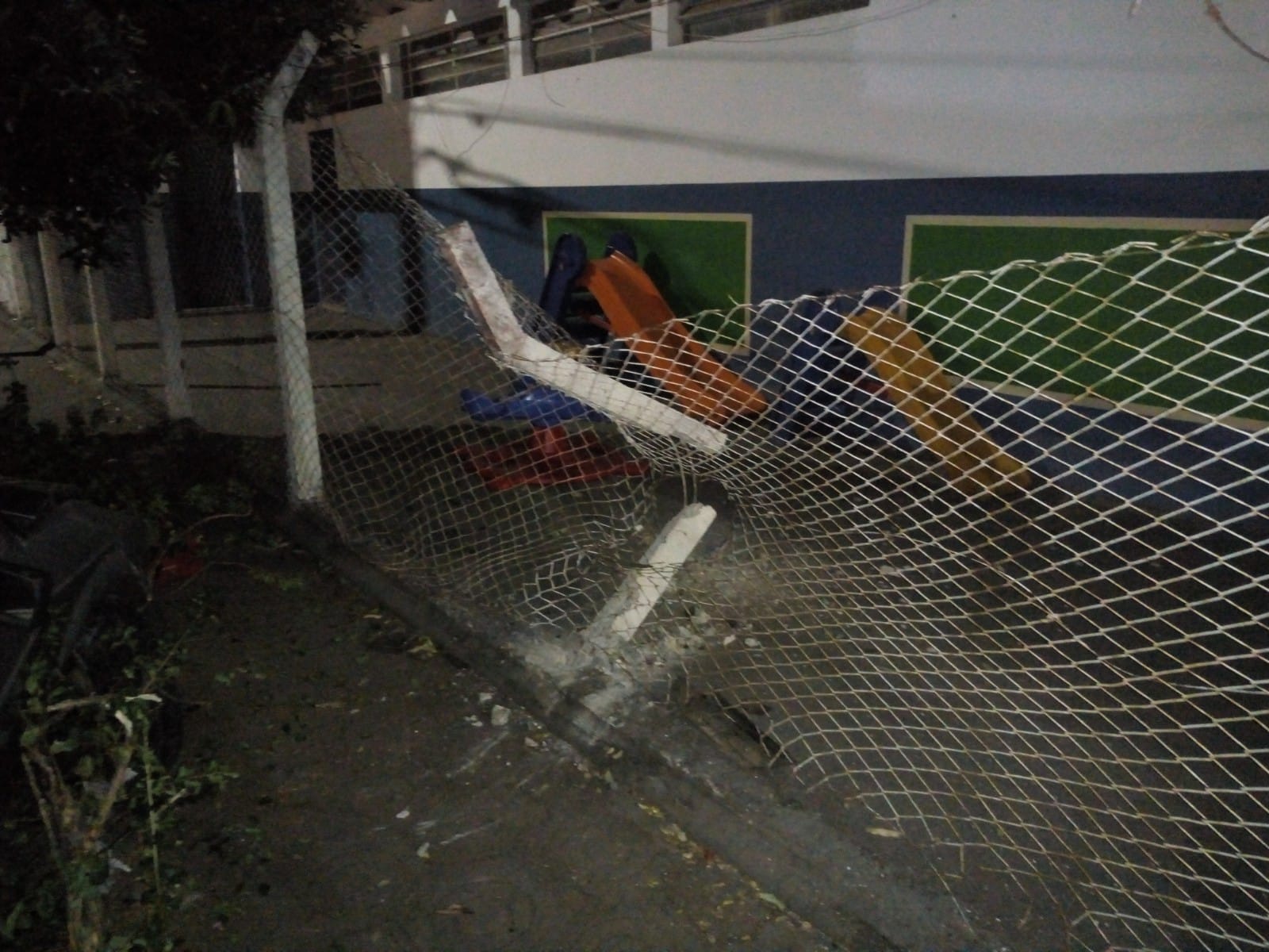 Um veículo Gol foi abandonado na noite de sexta-feira, 31-03-2023, após colidir em um mourão de uma escola na Rua Caetano Barion, Vila Jacobucci, São Carlos-SP.