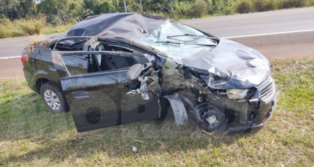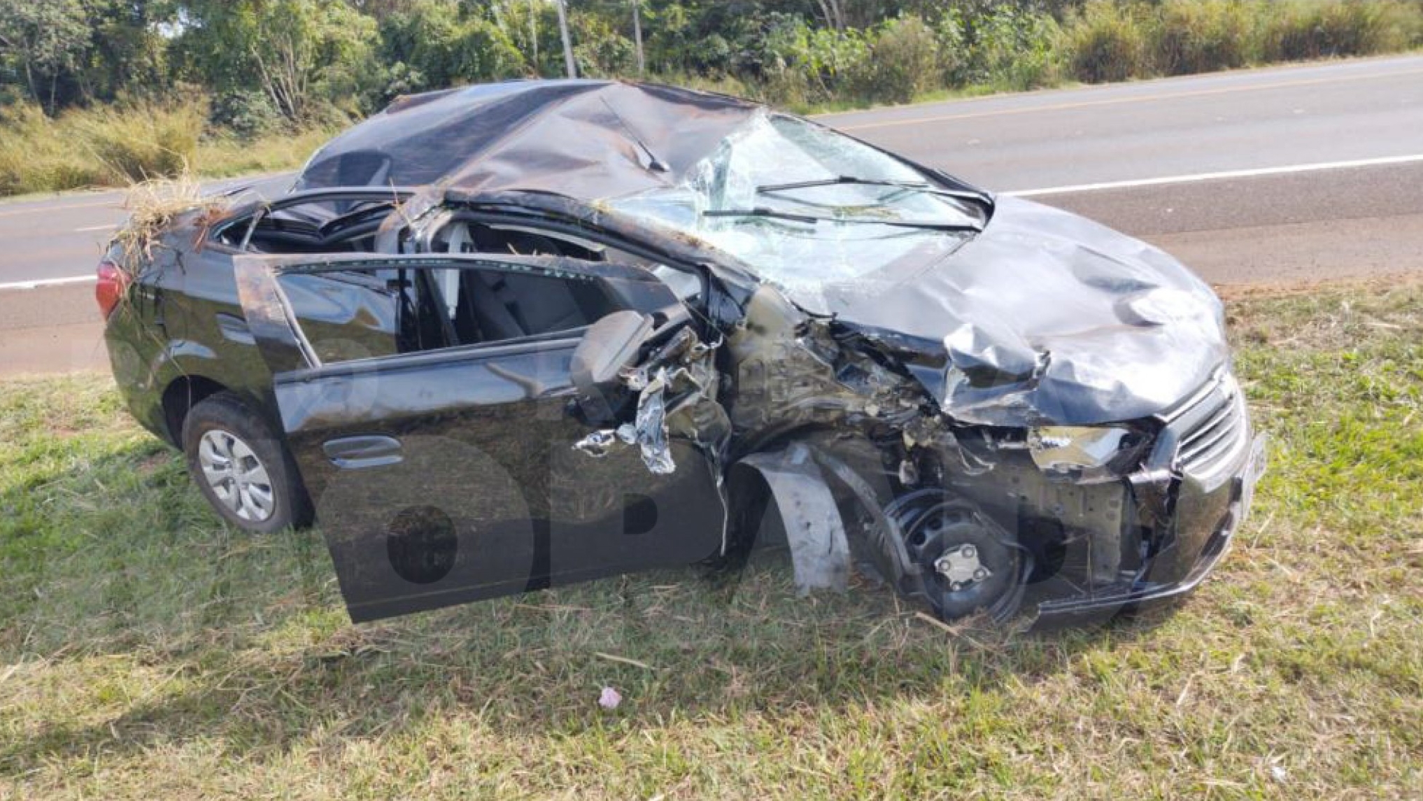 Com o impacto na lateral, o condutor perdeu o controle do carro, capotou e parou no canteiro. Apesar dos danos no veículo, o homem, de 35 anos, não se feriu.