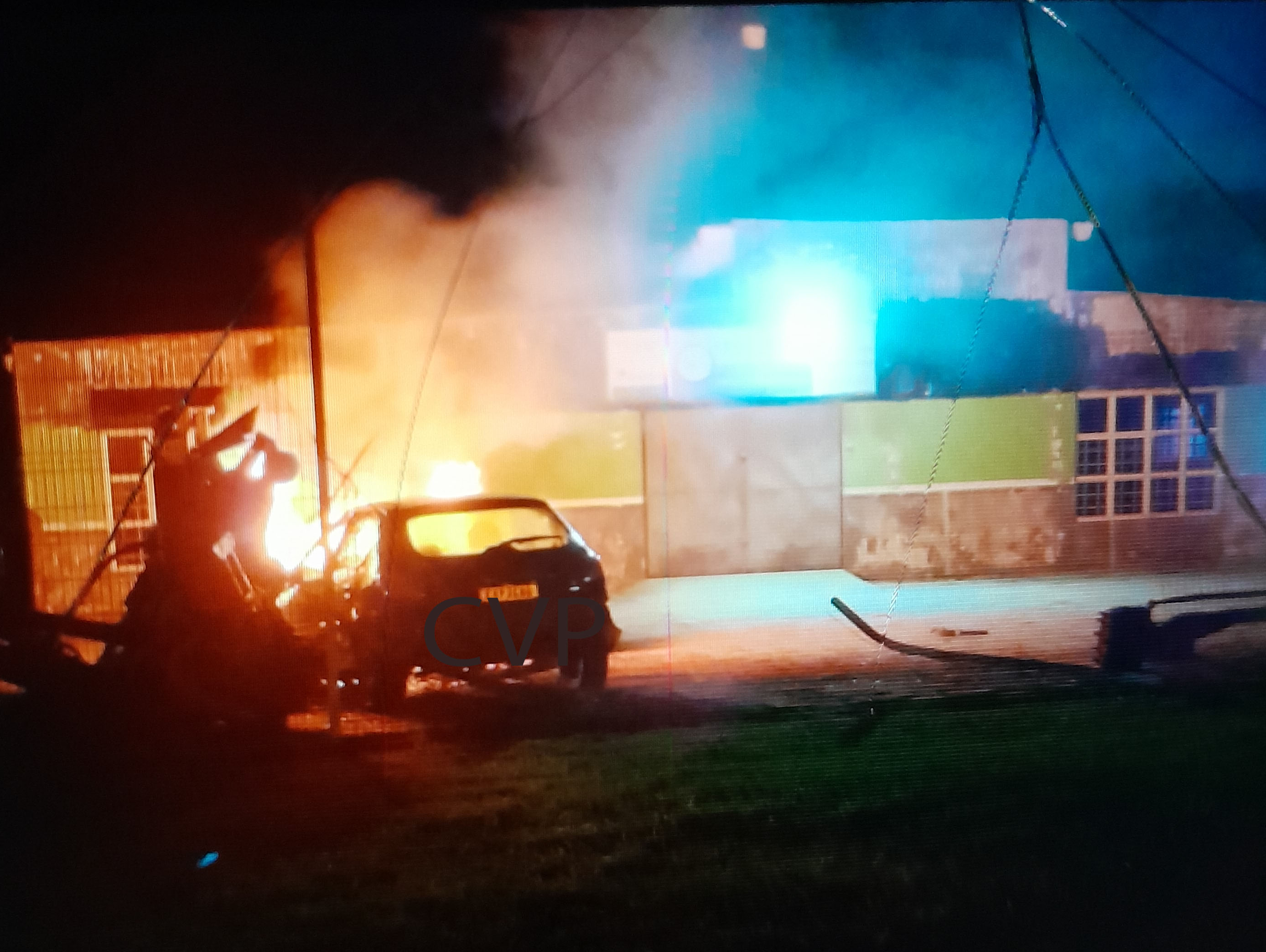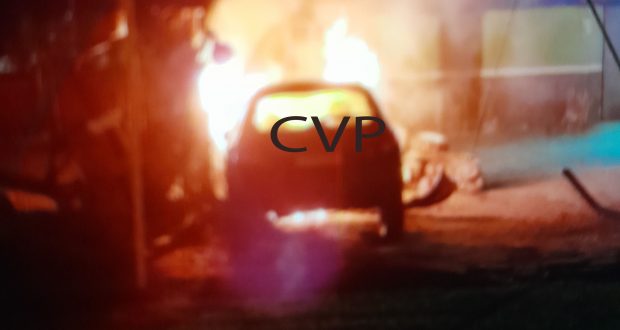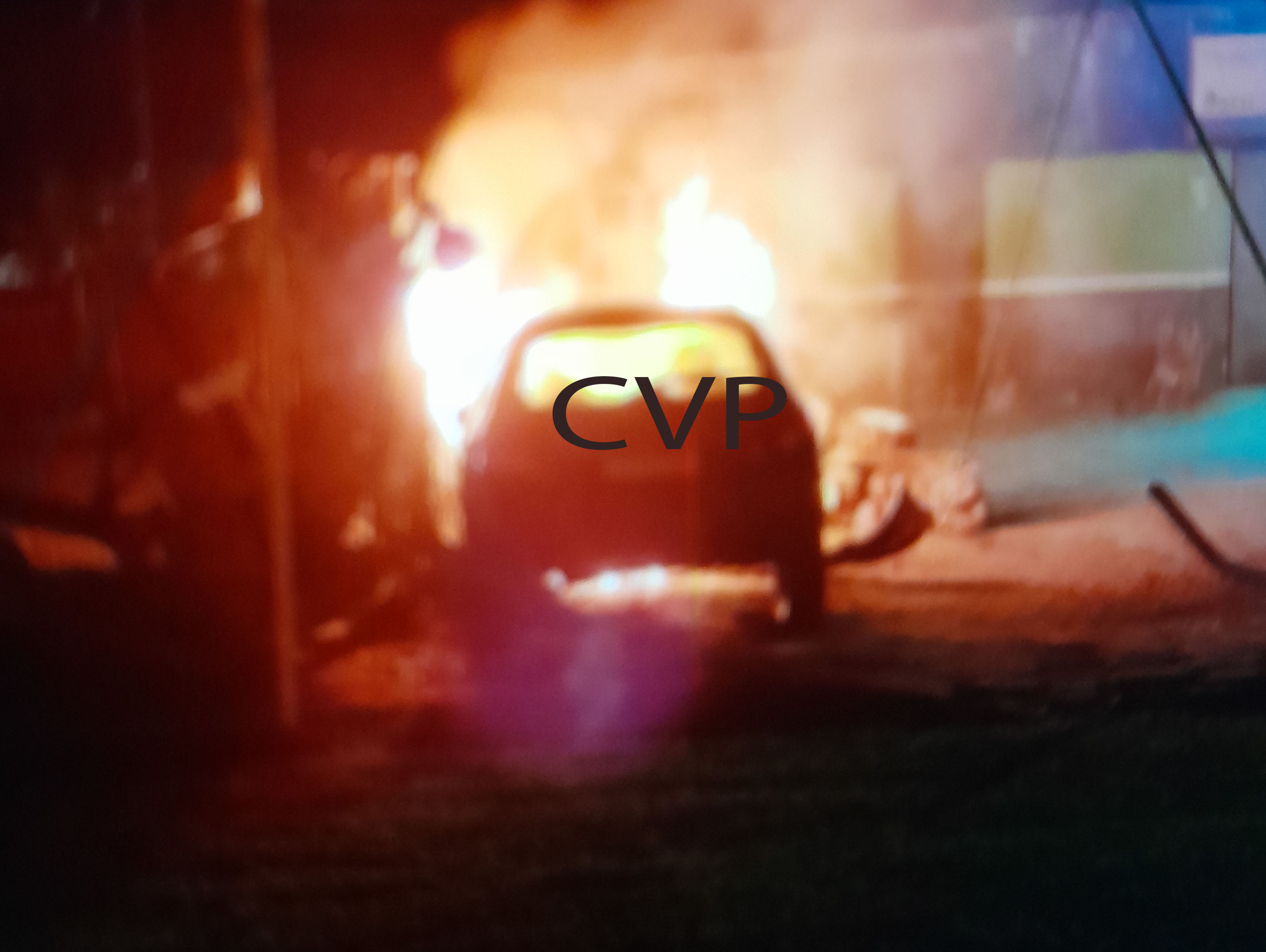 Um veículo Peugeot ficou completamente destruído por um incêndio no início da noite de sábado, 20-05-2023, no km 248 da rodovia Washington Luís, Ibaté-SP.