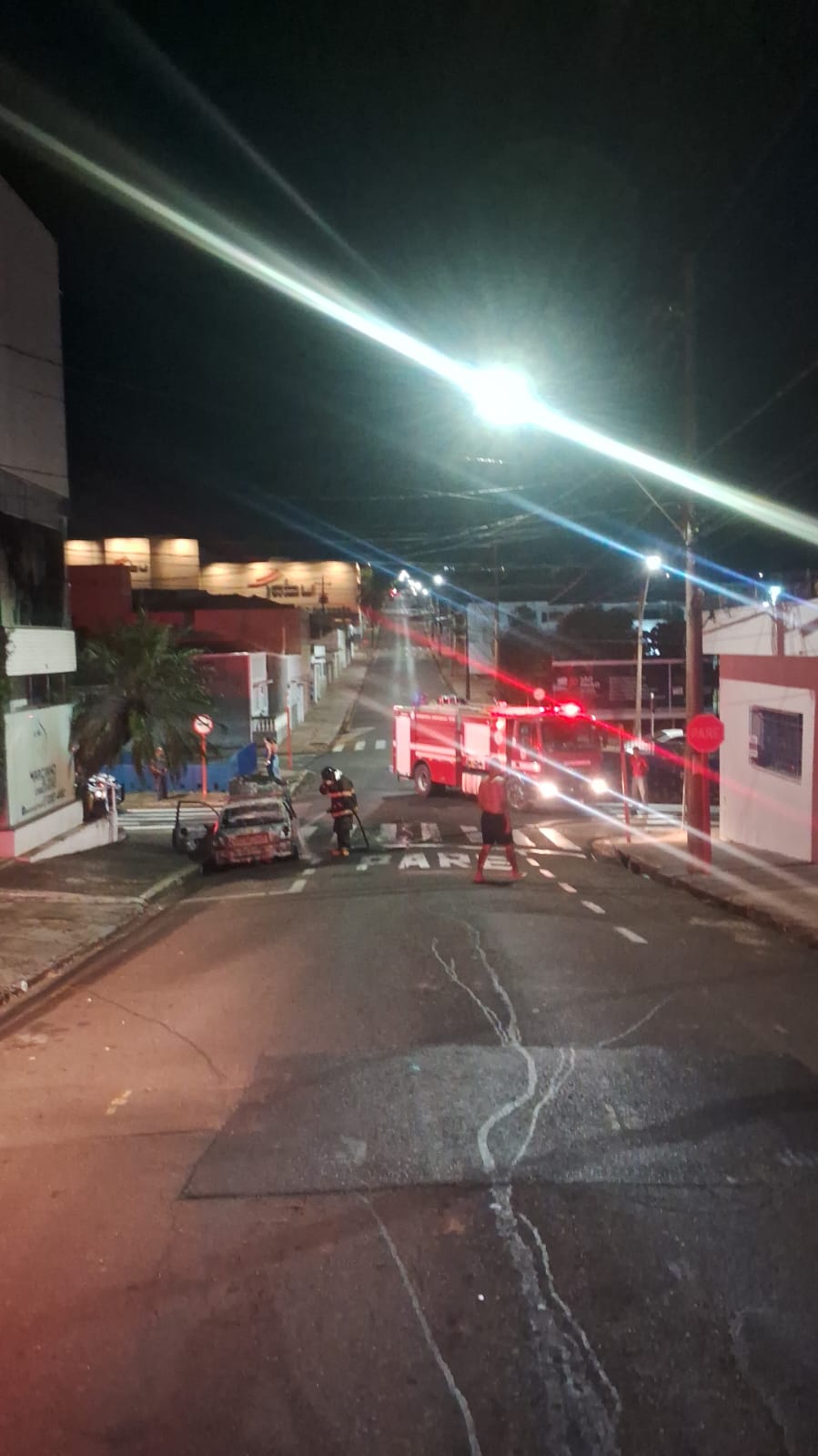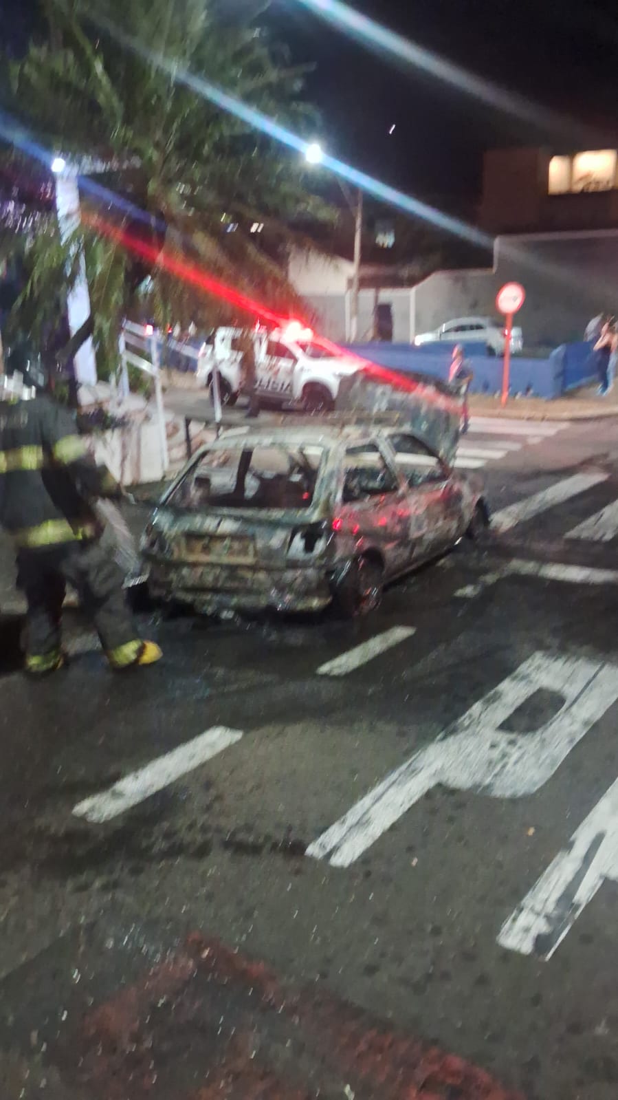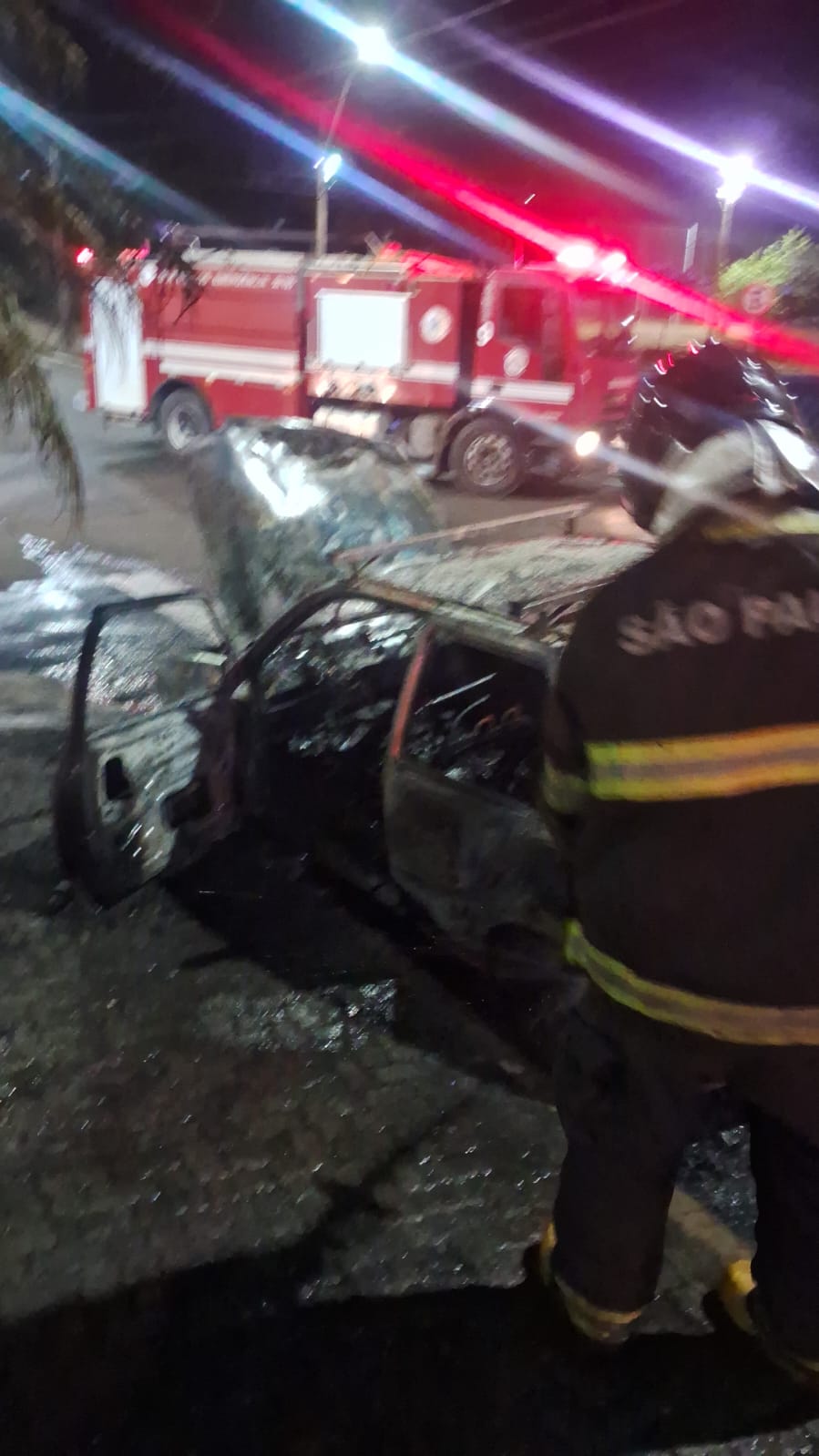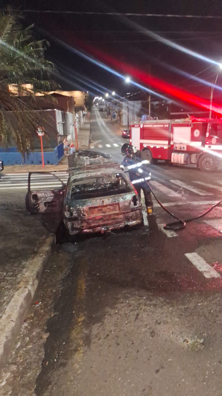 Um incêndio devorou um veículo Peugeot nesta noite de quinta-feira, 27/03/2025, na Rua Dom Pedro, cruzamento com a Av. Comendador Alfredo Maffei, Centro de São Carlos-SP.