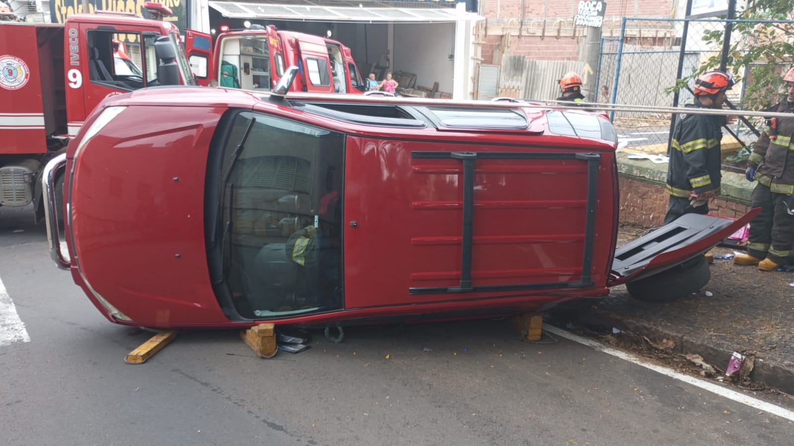 Uma mulher ficou ferida nesta tarde de segunda-feira, 8 de abril de 2024, em um tombamento de carro na Rua Aquidaban, cruzamento com a Rua  Conde Pinhal , Centro de São Carlos-SP.
