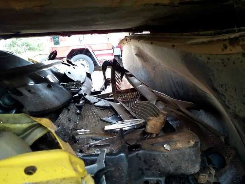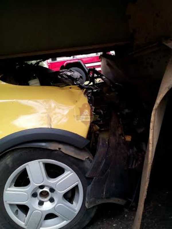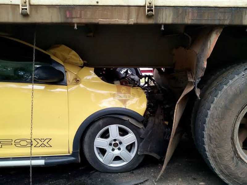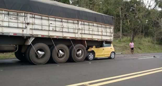 Um carro foi parar debaixo de um caminhão por volta das 12:00 deste sábado, 16-07, no km 9 da rodovia Domingos Inocentini, estrada do Broa.