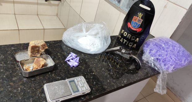 De acordo com informações, uma equipe da Força Tática, composta pelo sargento Strozze, cabos Prado e Tiago, ao verificar uma denúncia de tráfico de droga em um depósito de material reciclável, abordou uma mulher, a qual estava com um volume na cintura. Por se tratar de mulher, foi pedido apoio de uma viatura com uma policial, para que fosse realizada a busca pessoal na suspeita. Enquanto os policiais aguardavam o apoio, chegou o marido da abordada. Ambos ficaram exaltados e investiram contra os policiais, que tiveram que agir de força moderada para garantir a integridade física da equipe. Os PMs tiveram que usar a taser, contra o indivíduo, o qual acabou sendo contido e algemado. Durante as medidas de contenção, a mulher tentou fuga a pé e foi alcançada e contida com uso da força. Com ela havia uma porção de crack, porções de cocaína e uma balança de precisão. Verificado a residência na presença do genitor do preso, foi localizado uma porção de cocaína com micro tubos vazios para embalagem da droga, uma pedra bruta de crack, uma garrucha marca Rossi , calibre 22, com 07 cartuchos íntegros. O casal foi encaminhado para a Central de Polícia Judiciária, autuado em flagrante e recolhido ao Centro de Triagem de São Carlos.