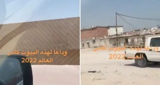 A escrita em árabe que aparece no vídeo diz: “A copa do mundo dá adeus a essas casas”. Originalmente, o vídeo foi publicado por uma conta do TikTok.