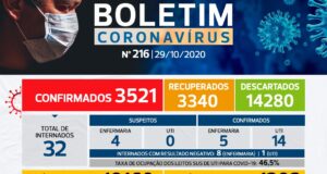 NÚMEROS COVID-19 SÃO CARLOS – 29/10 – BOLETIM Nº 216 A Vigilância Epidemiológica de São Carlos confirma nesta quinta-feira (29/10) os números da COVID-19 no município. São Carlos contabiliza neste momento 3.521 casos positivos para COVID-19 (41 resultados positivos foram divulgados hoje), com 52 óbitos confirmados e 86 descartados. Dos 3.521 casos positivos, 3.215 pessoas apresentaram síndrome gripal e não ...
