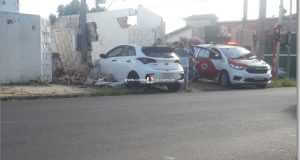 Um veículo Hb20 da cor branca, derrubou parte de um muro nesta tarde de quarta-feira, 29 de janeiro de 2020, na Avenida Antônio Blanco, com a Rua São Joaquim, bairro Costa do Sol, São Carlos-SP. Segundo informações, apesar dos danos materiais, não houve feridos. A PM esteve no local e tomou as medidas cabíveis. Foto: colaborador