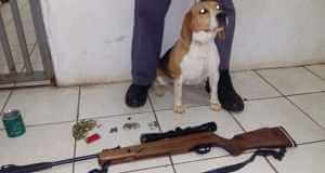 Na noite dessa segunda-feira (11), na Avenida Said Azzen, Jardim Vale Verde, em Araraquara, a Rocam, após denúncia anônima, conseguiu abordar Cleyton William Borges e localizar uma espingarda e drogas. No local, com apoio do canil, a cachorra Holy encontrou 4 porções de maconha e pinos de cocaína enterrados no quintal da casa do autor onde os policiais encontraram uma ...