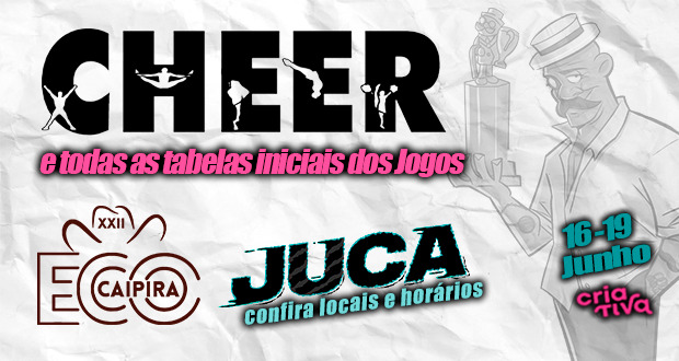 Conheça a modalidade mais colorida e rítmica dos jogos e, todas as tabelas iniciais do torneios do JUCA e ECO CAIPIRA Você já ouviu falar em cheerleading? A modalidade será apresentada no evento universitário que ocorrerá em São Carlos, interior de São Paulo, nesse final de semana prolongado do feriado de Corpos Christi. Veja a programação dos jogos e não fique de fora dos inúmeros torneios que acontecerão pelo município, abertos ao público e com entrada franca.