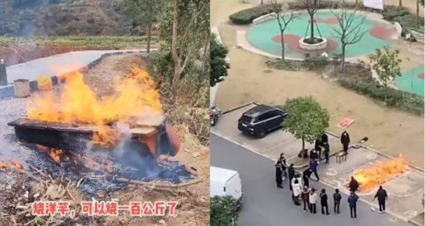 Em outro registro, que teria sido feito em Xangai, um grupo de pessoas aparece ao redor de uma pira improvisada em um estacionamento.