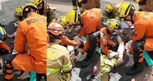 O Corpo de Bombeiros foi acionado e atendeu a vítima, que tinha uma fratura exposta, lesão na pelve e machucados pelo corpo. O homem estava consciente e desorientado, e foi encaminhado em estado grave para o Hospital de Base do DF.