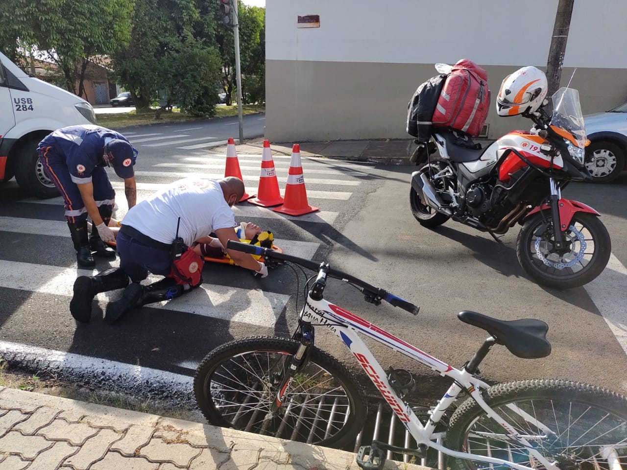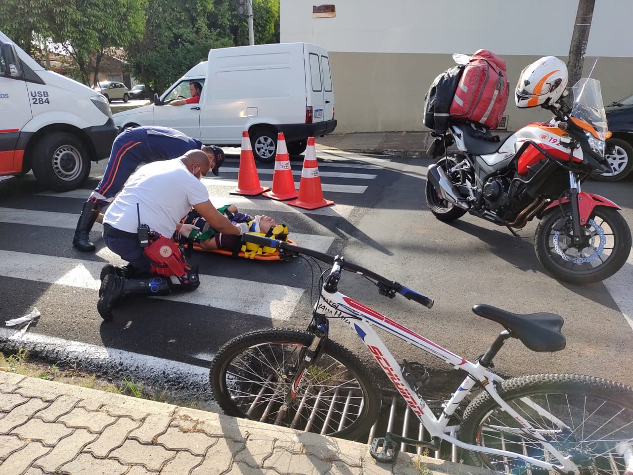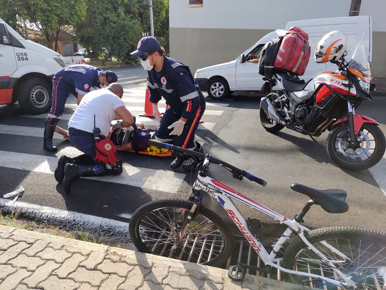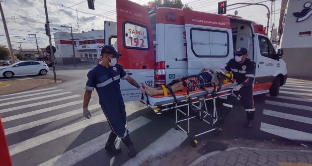 Um ciclista ficou ferido nesta tarde de quinta-feira, 1 de abril de 2021, no cruzamento da Travessa Sete, com a Av. Grécia, região do bairro Vila Prado, São Carlos-SP.