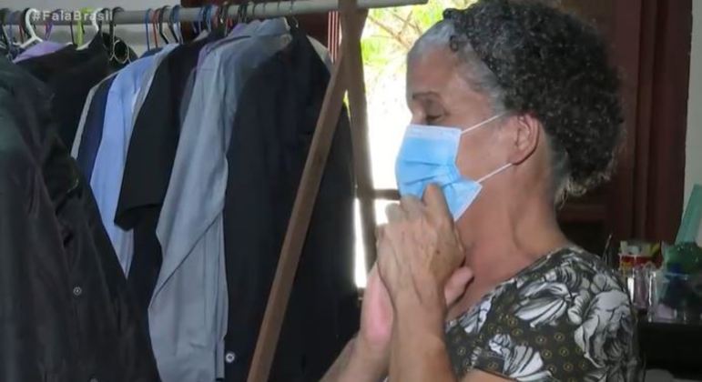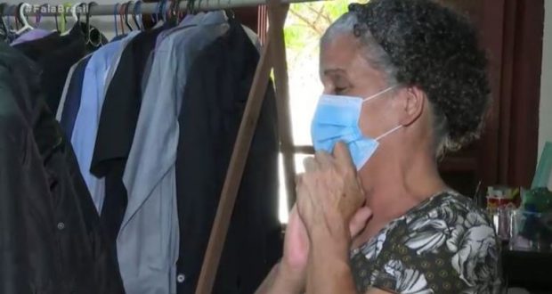 Usando o vestido da filha Flaviana e mostrando as roupas da família, ela se emocionou: “Isso foi o que sobrou dos meus filhos. Só isso. Eu vejo eles com a roupa, sabe? Vejo o Ruan brincando com o videogame”.