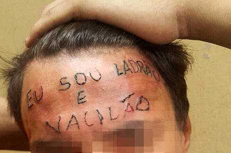 Flagrado pelo tatuador e o pedreiro, R.R. foi rendido e obrigado a pedir para ser tatuado na testa. O vídeo divulgado nas redes sociais mostra o rapaz acuado, sentado em um corredor da pensão, enquanto os agressores se divertem com a situação: “vai doer… vai doer!”, comenta o tatuador.