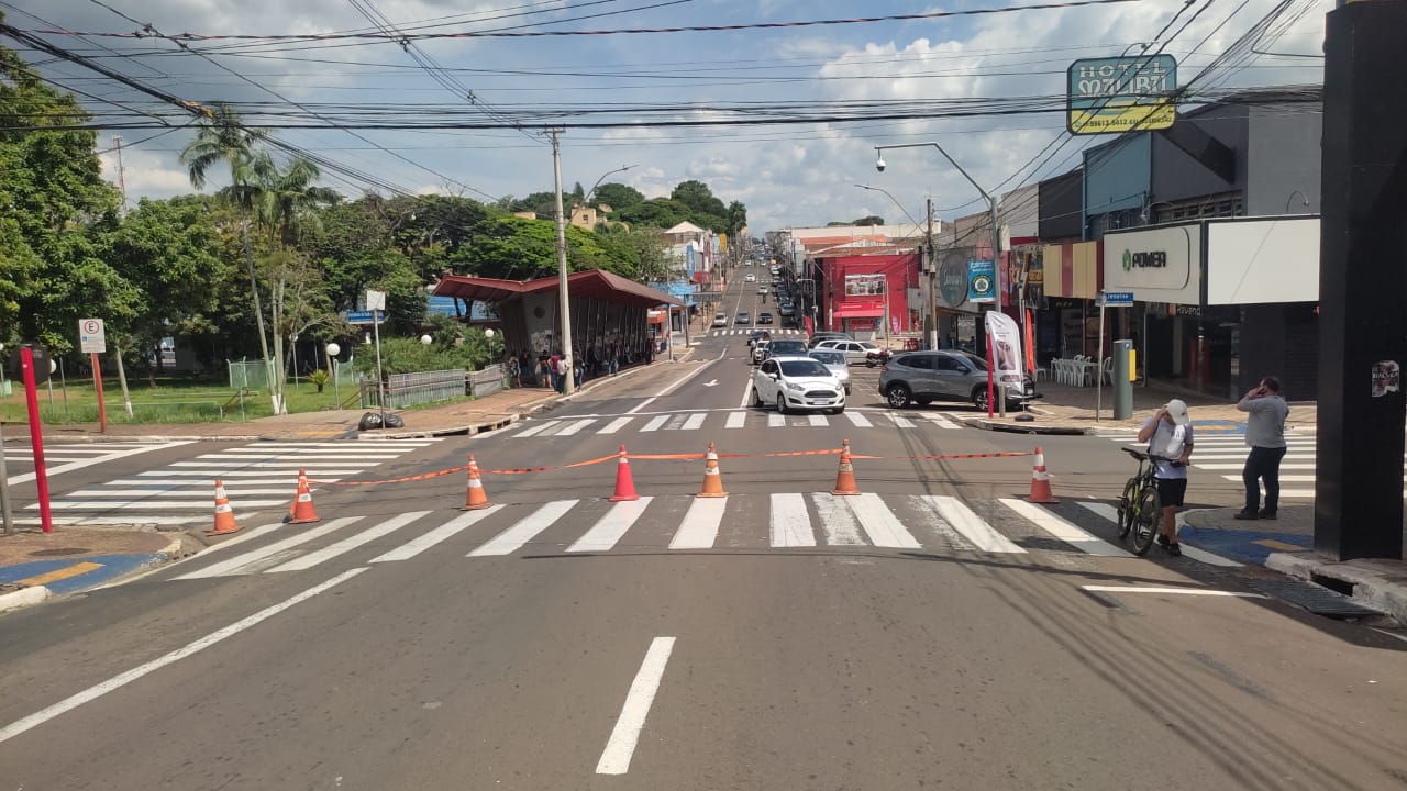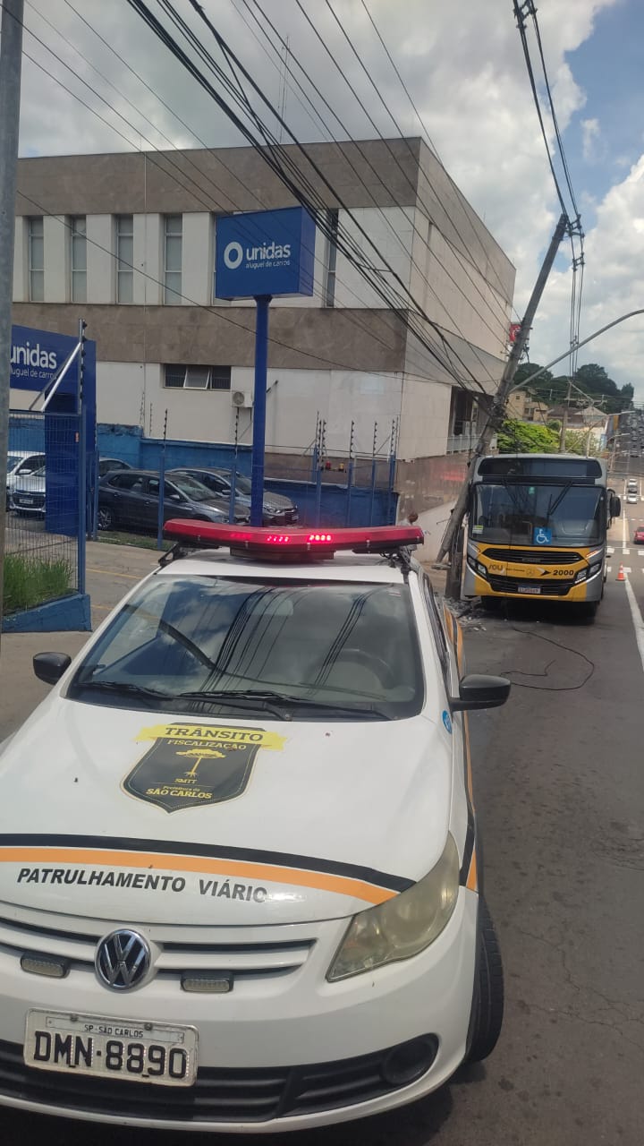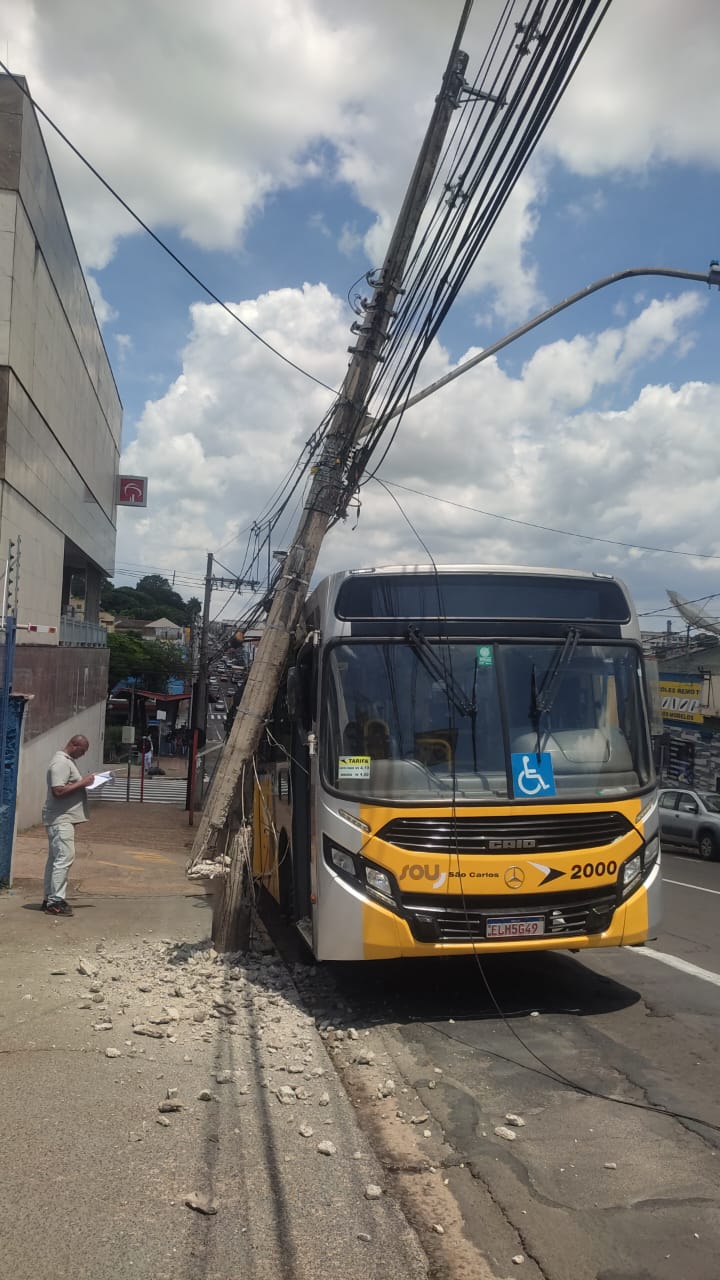 Um coletivo danificou um poste nesta tarde de terça-feira, 27 de fevereiro de 2024, na Avenida São Carlos, subida da Catedral, São Carlos-SP.