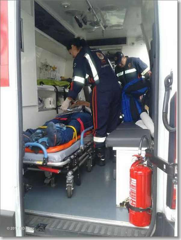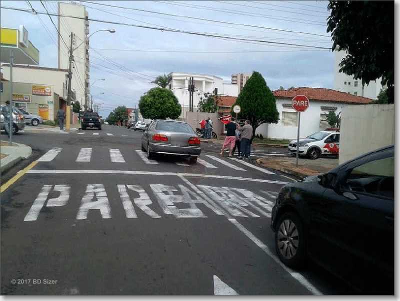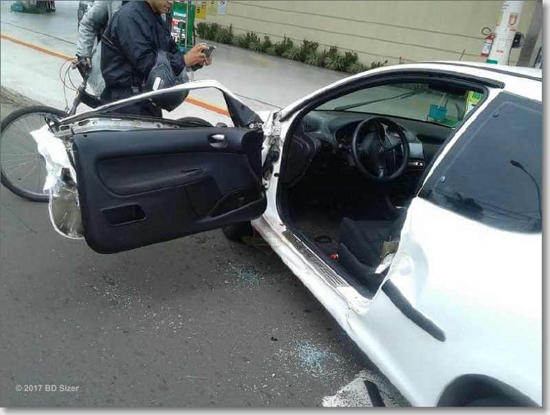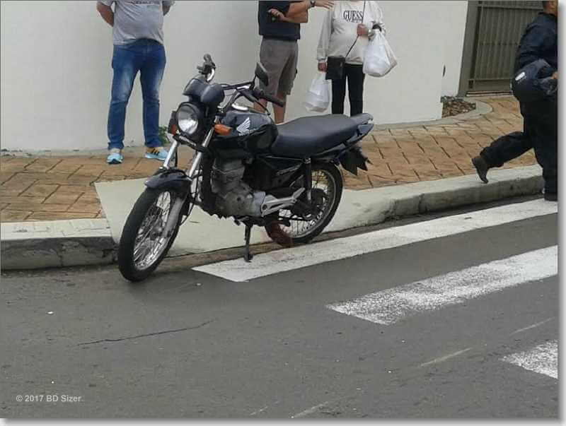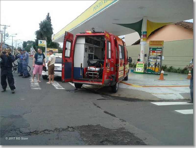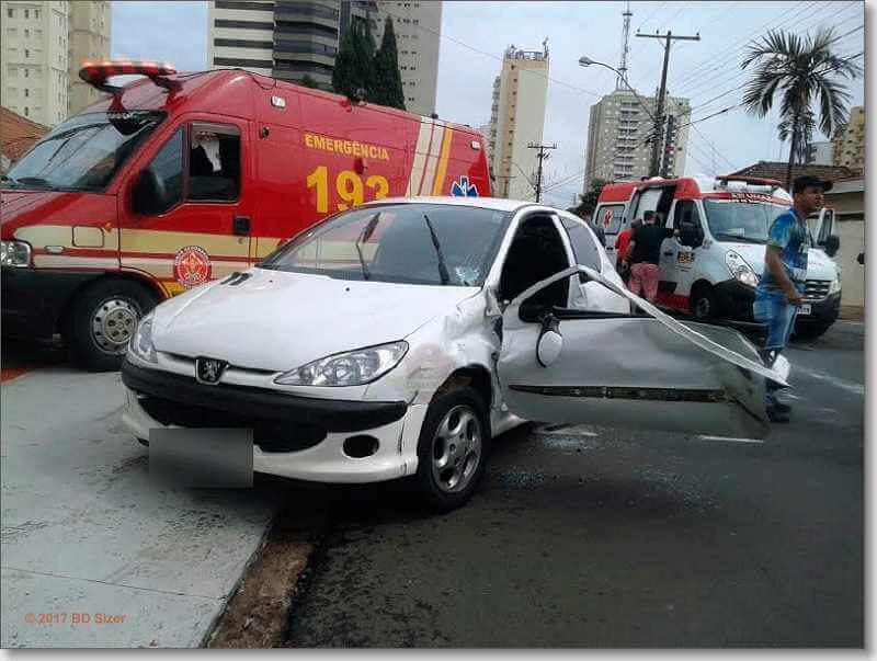 Segundo testemunhas, a moto conduzida por Leandro Carlos Jaques, de 29 anos, estava pela rua São Paulo e o Peugeot conduzido por Wilson. L. Carvalho Jr., de 38 anos, pela rua XV de  Novembro. O SAMU e Corpo de Bombeiros estiveram no local e encaminharam as vítimas à Santa Casa de Misericórdia. A Polícia Militar foi acionada e tomou as medidas cabíveis.