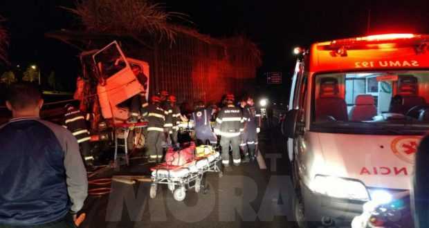 O motorista do caminhão bi-trem, de 67 anos, ficou preso nas ferragens e viaturas do Corpo de Bombeiros foram acionadas para seu socorro. A vítima foi socorrida para a UPA Central com ferimentos leves.