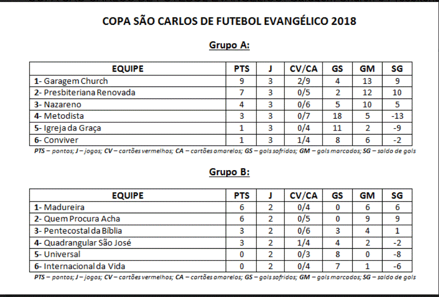 Após jogar pela terceira vez, as equipes do Grupo A da Copa São Carlos de Futebol Evangélico começam a dar indícios de suas ambições na competição. Neste sábado (10), a disputa pela liderança da chave tornou-se uma exclusividade para poucos. Diferente da briga pelo G4, que tem quatro times distando apenas três pontos.