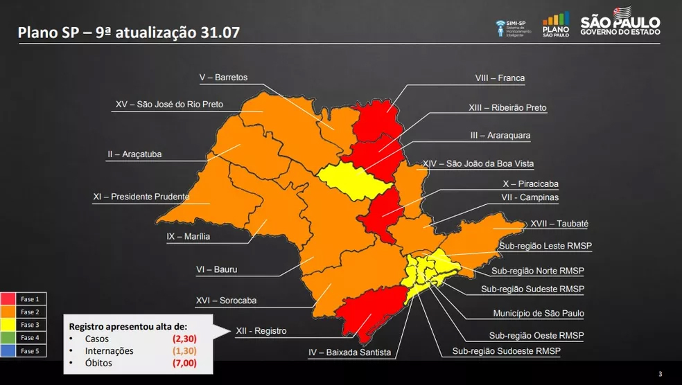 Com a décima primeira atualização divulgada, a única mudança na região será em relação ao novo horário anunciado por Rodrigo Garcia na quarta-feira (19), que muda de 6h para 8h diárias, a permissão do funcionamento na Fase Amarela.