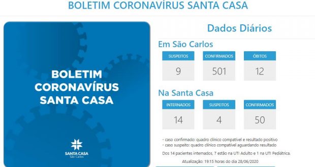 A Santa Casa informa, neste *domingo (28/06)*, que o número de casos confirmados no hospital subiu de *49* para *50*. Trata-se de 1 homem, 63 anos, de São Carlos, internado em leito de enfermaria desde 27/6 e para quem o resultado positivo foi liberado ontem.